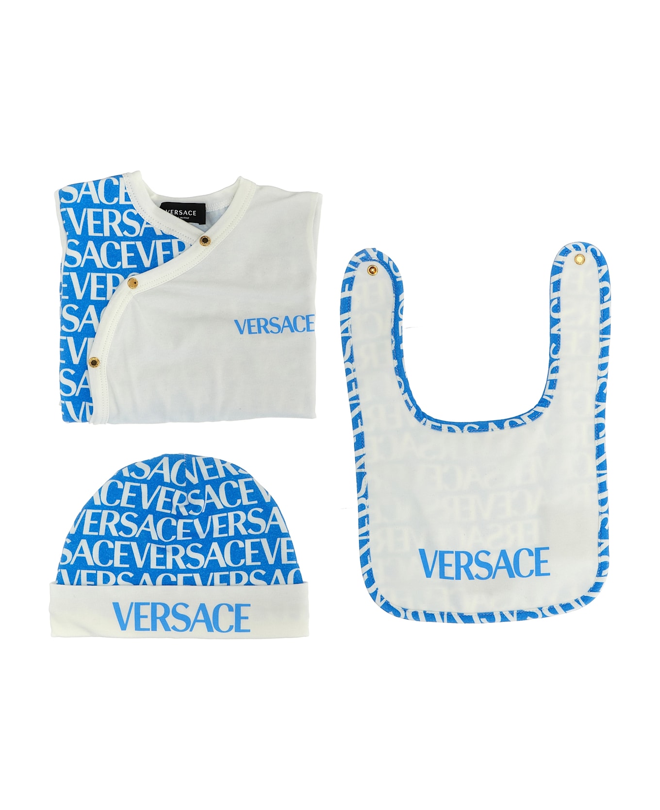 All-over logo print cotton baby set with solid color details consisting of hat, bib with snap button closure and bodysuit with front snap button closure, V-neck, long sleeves with cuffs. Composition: 94% cotton 6% elastane