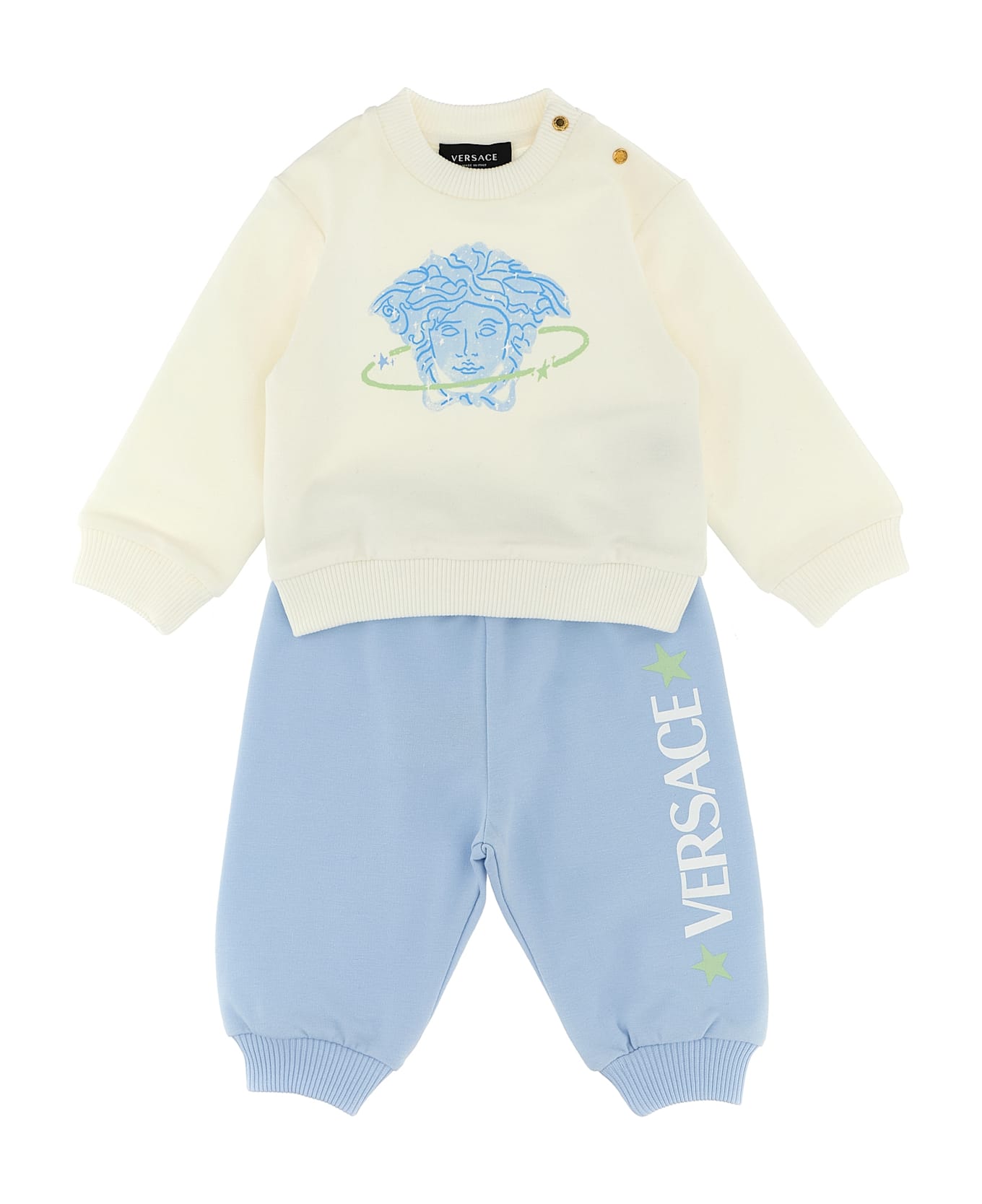 KIDS Stretch brushed cotton suit consisting of sweatshirt with front logo print, crew neck, long sleeves with cuffs, snap buttons on the shoulder and joggers with front logo, elastic waistband, pockets, ankle cuffs.