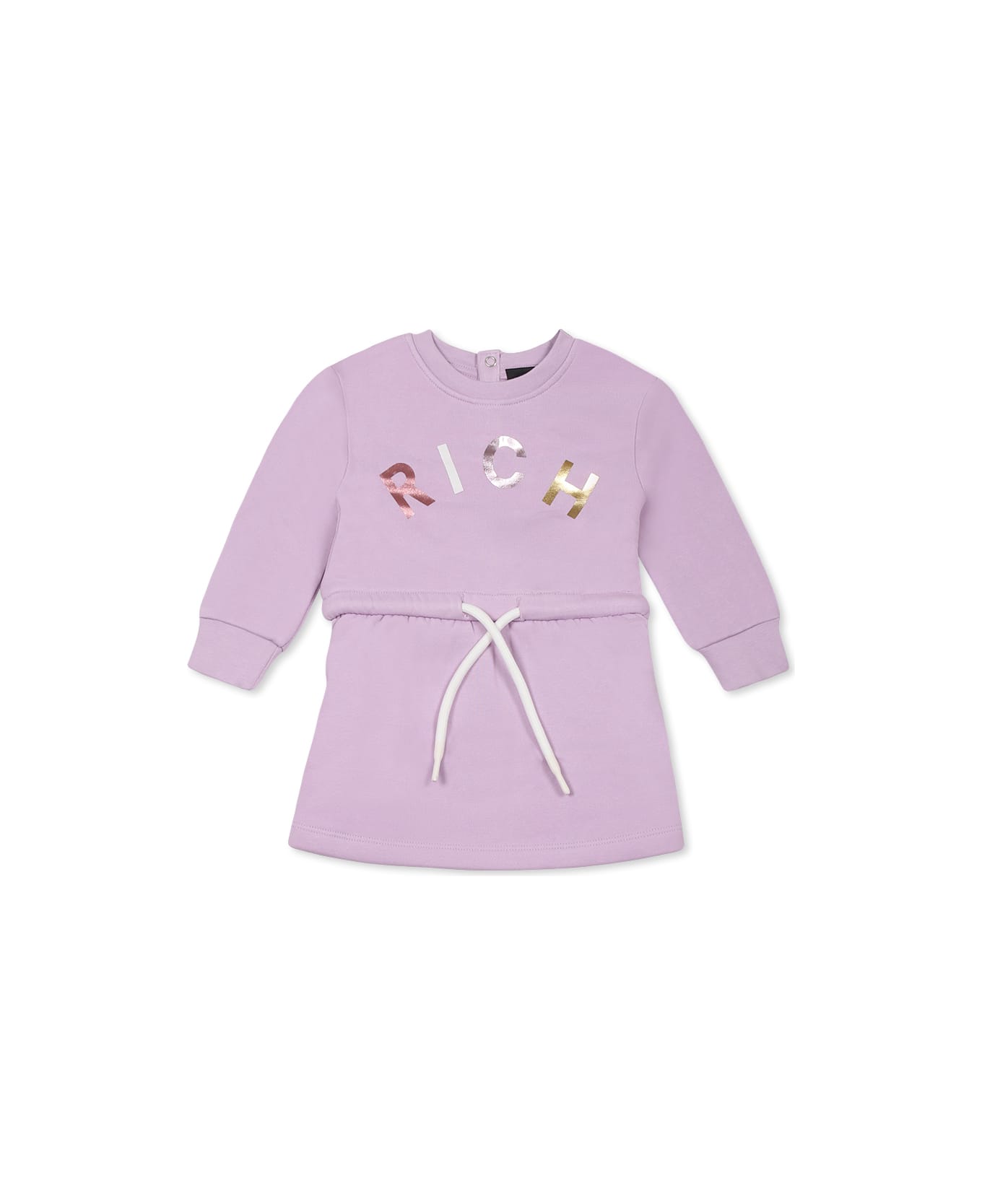 Lilac cotton blend dress, fleece, long sleeves, with ribbed crew neck, snap button fastening on the back and drawstring waist. It is embellished with a laminated front logo.
