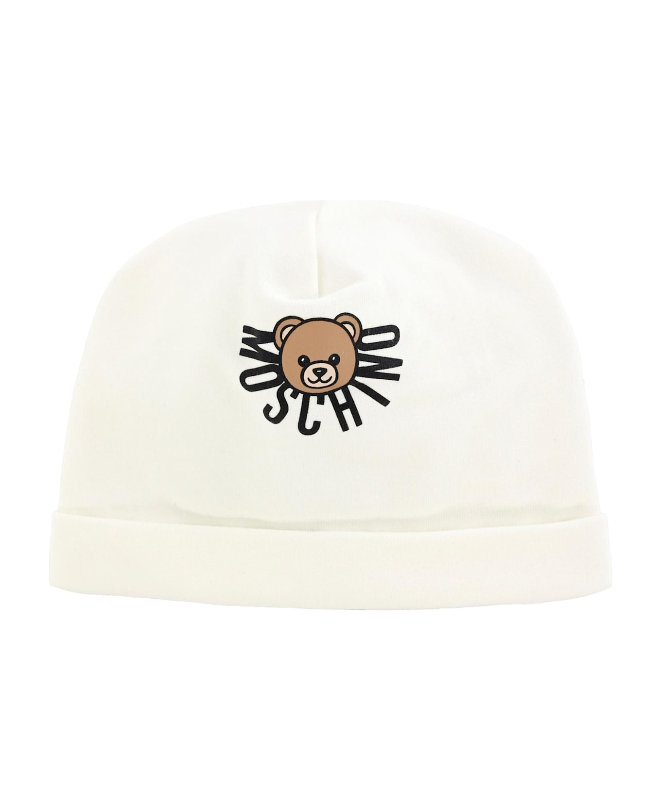 Ivory hat from the Moschino Kids brand, made of mixed cotton, with cuff; it is embellished with Teddy Bear and circular logo.