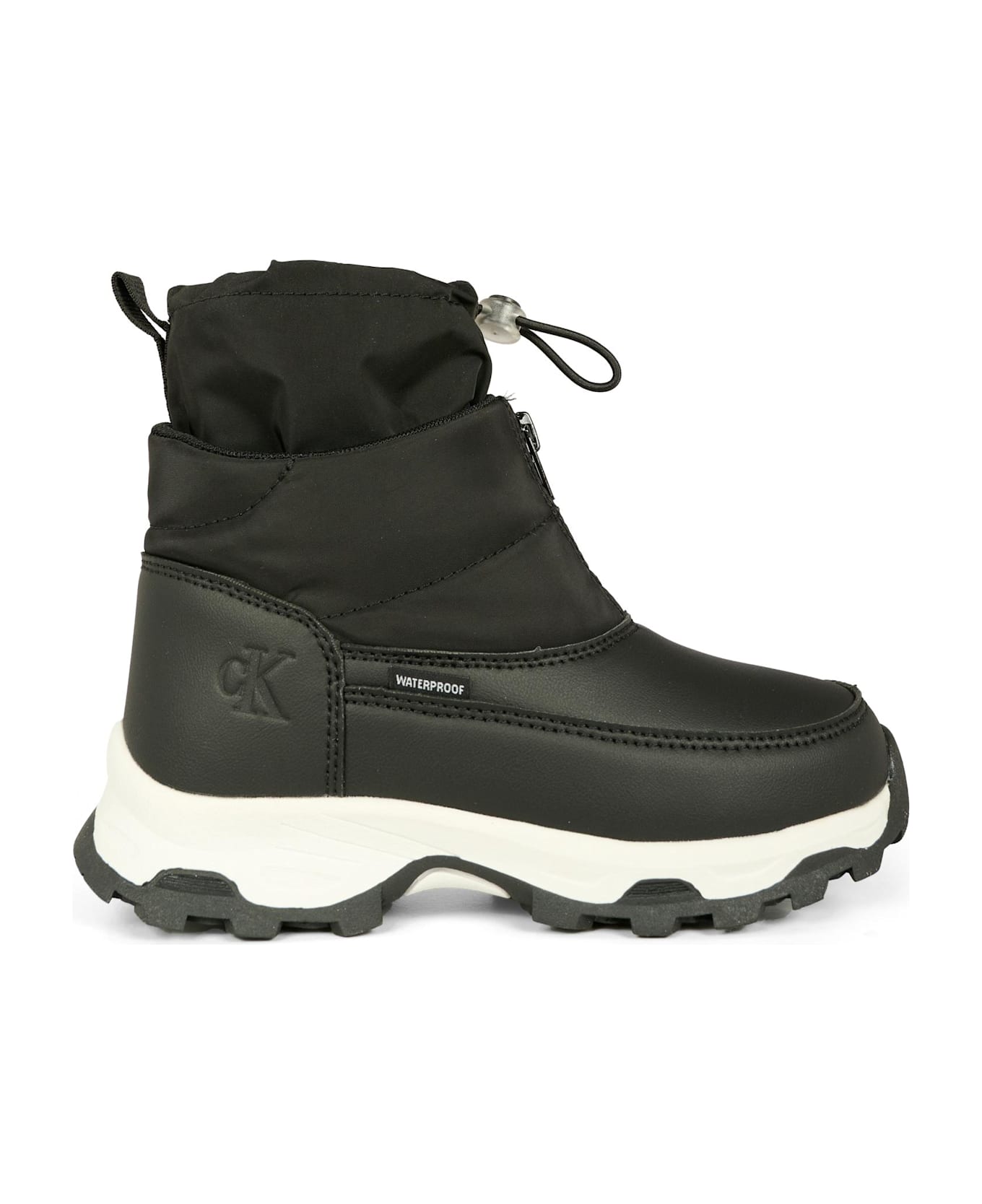 Black waterproof ankle boots with rubber soles, warm and soft faux shearling lining, drawstring, front zip, and round toe. They are embellished with an engraved logo on one side.