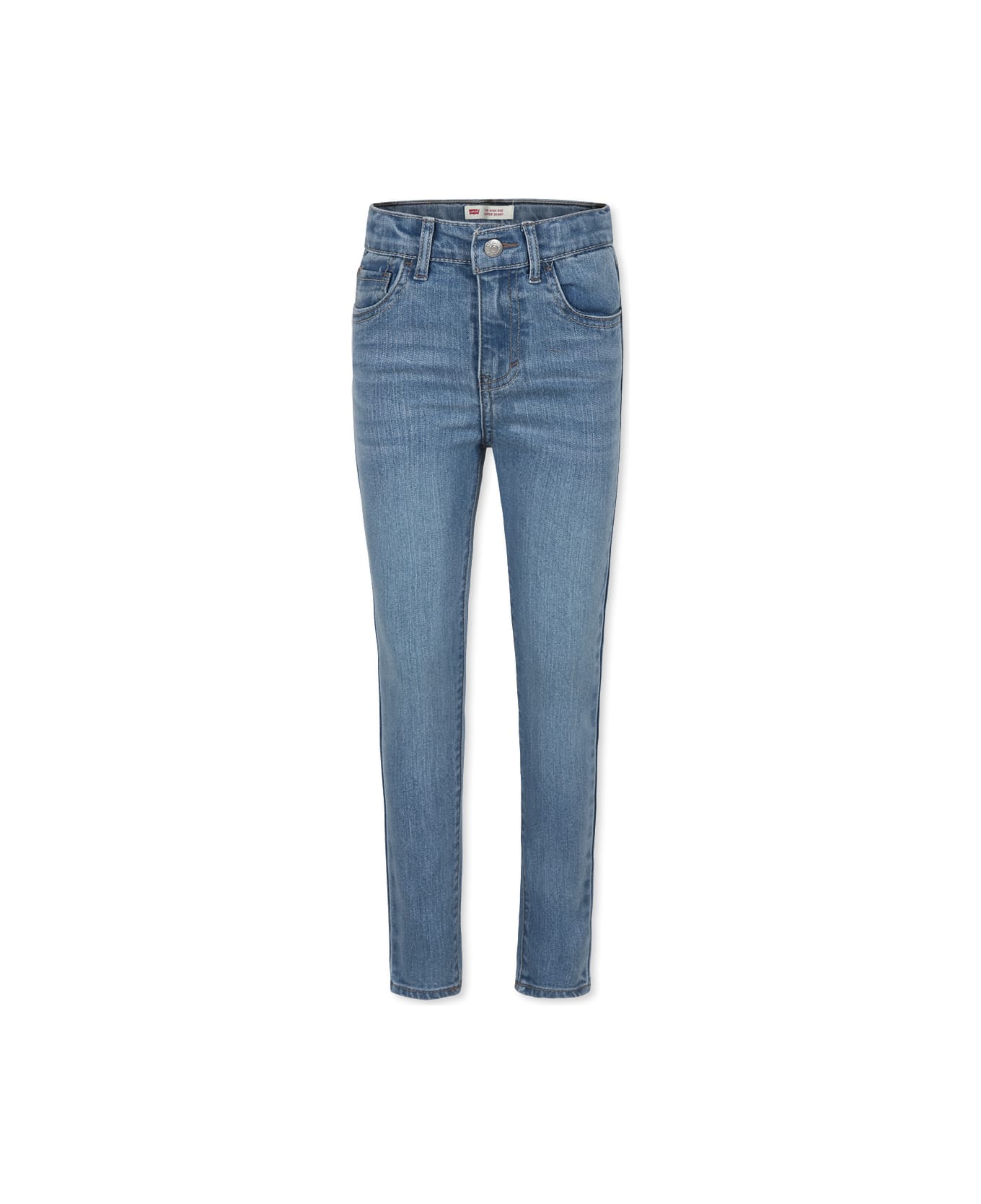 Blue denim skinny jeans, five pockets, with belt loops, front zip and hook closure, adjustable waist thanks to internal elastic with button. They are embellished with a logo patch on the back.