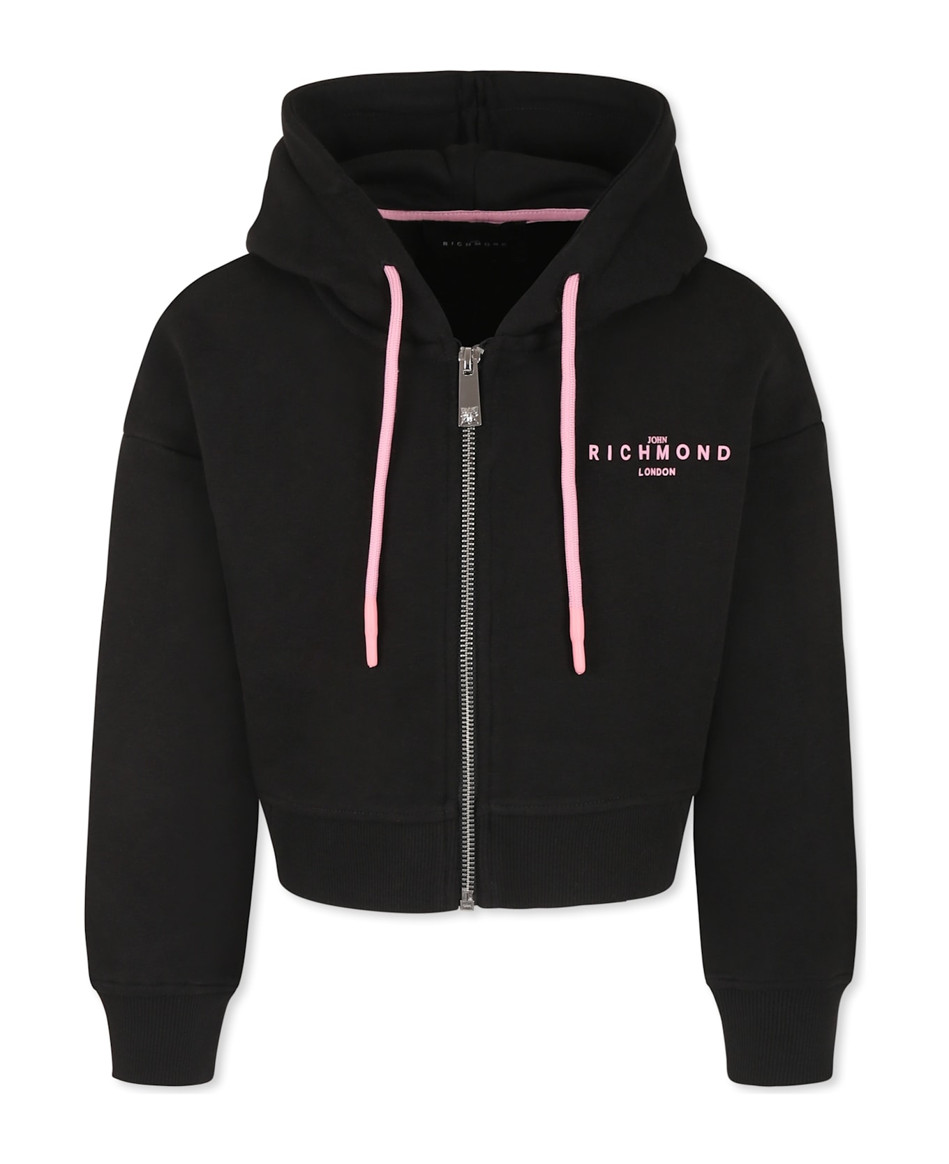 Pink crop sweatshirt in brushed cotton, long sleeves, with hood, front zip closure, ribbed cuffs and hem. It is embellished with logo on the chest and on the back.