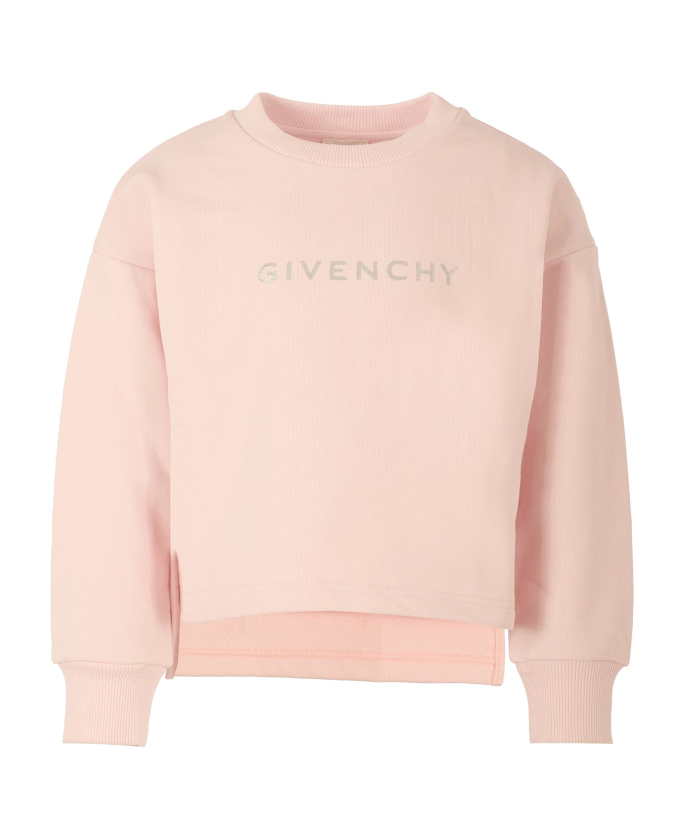 Pink sweatshirt from luxury brand Givenchy Kids, made of a lightly brushed organic cotton blend. It features long sleeves, a ribbed crew neck and cuffs, an asymmetric hem, and side slits. It is embellished with a logo print on the front and an iconic 4G motif on the back.