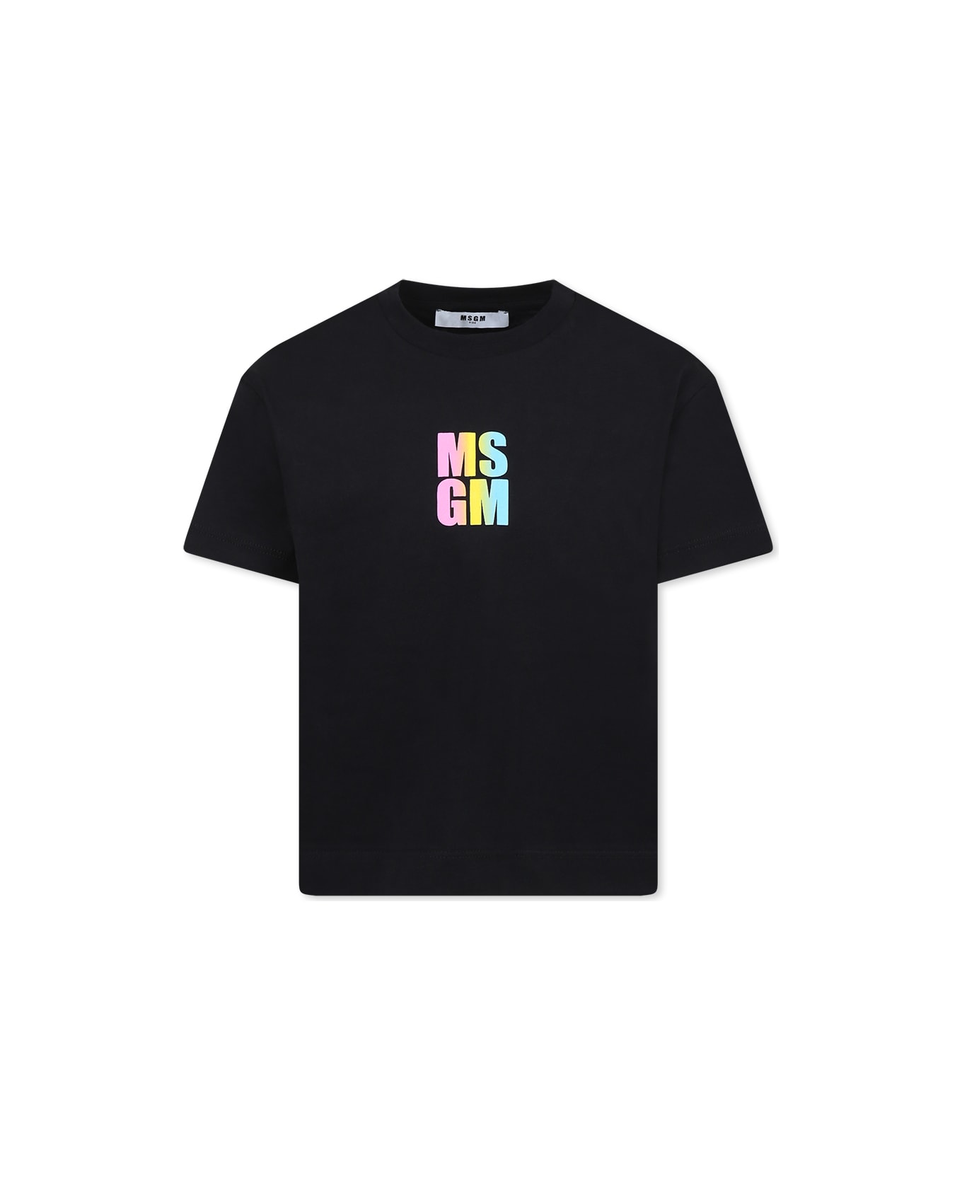 Black cotton t-shirt, with short sleeves and ribbed crew neck. It is embellished with multicolor logo on the front.