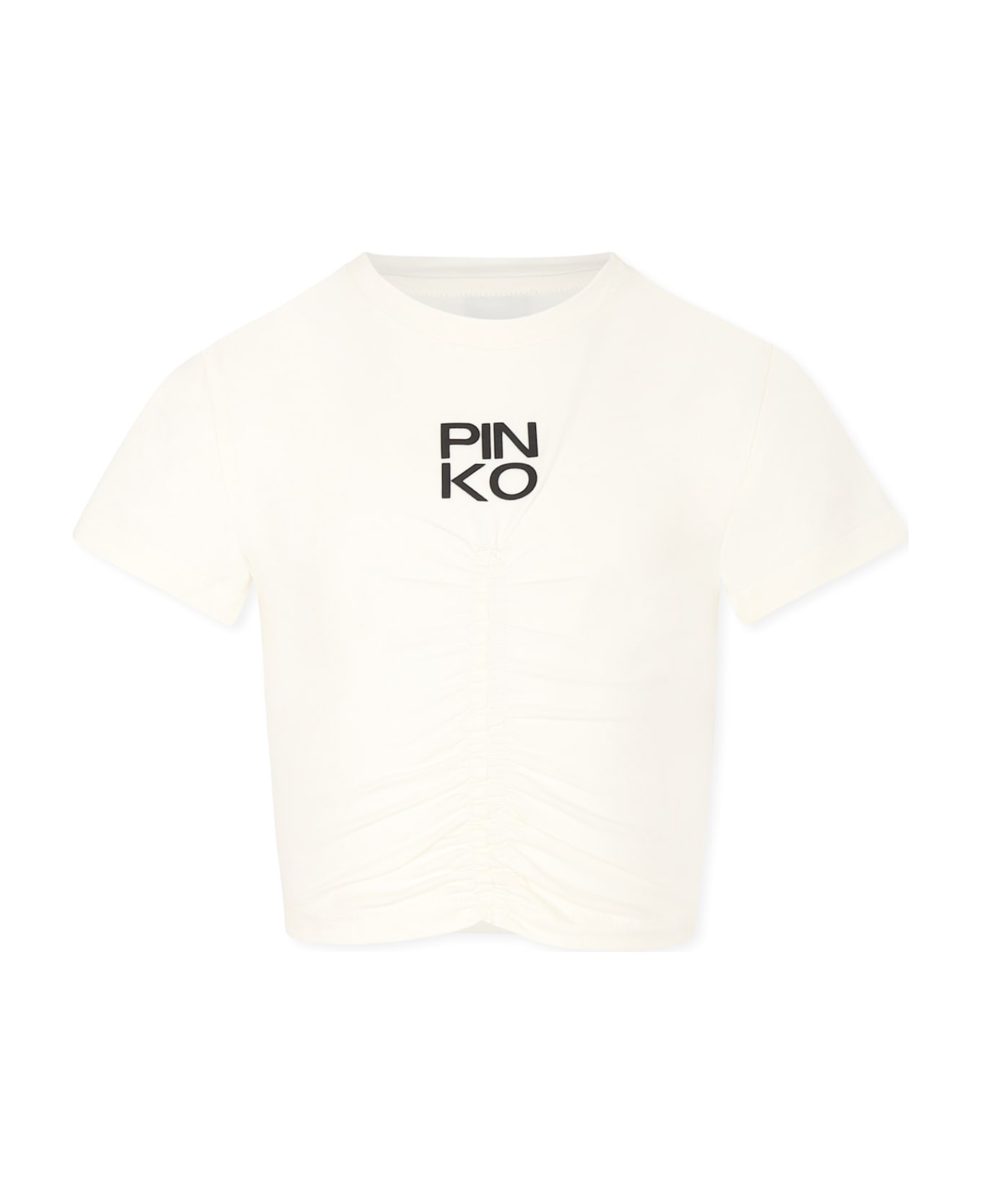 Ivory crop t-shirt, short sleeves, with crew neck and gathered detail on the front. It is embellished with black logo on the front.