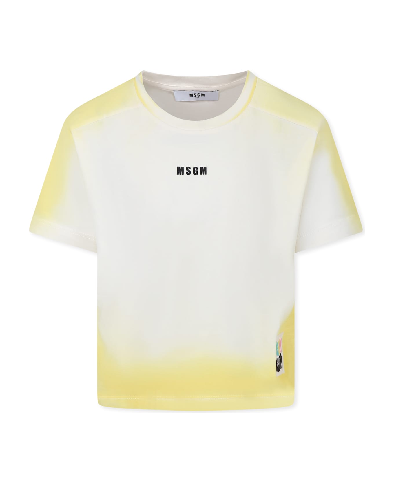 Yellow tie-dye t-shirt, in cotton, with short sleeves and ribbed crew neck. It is embellished with black MSGM logo and logoed patch on the front.