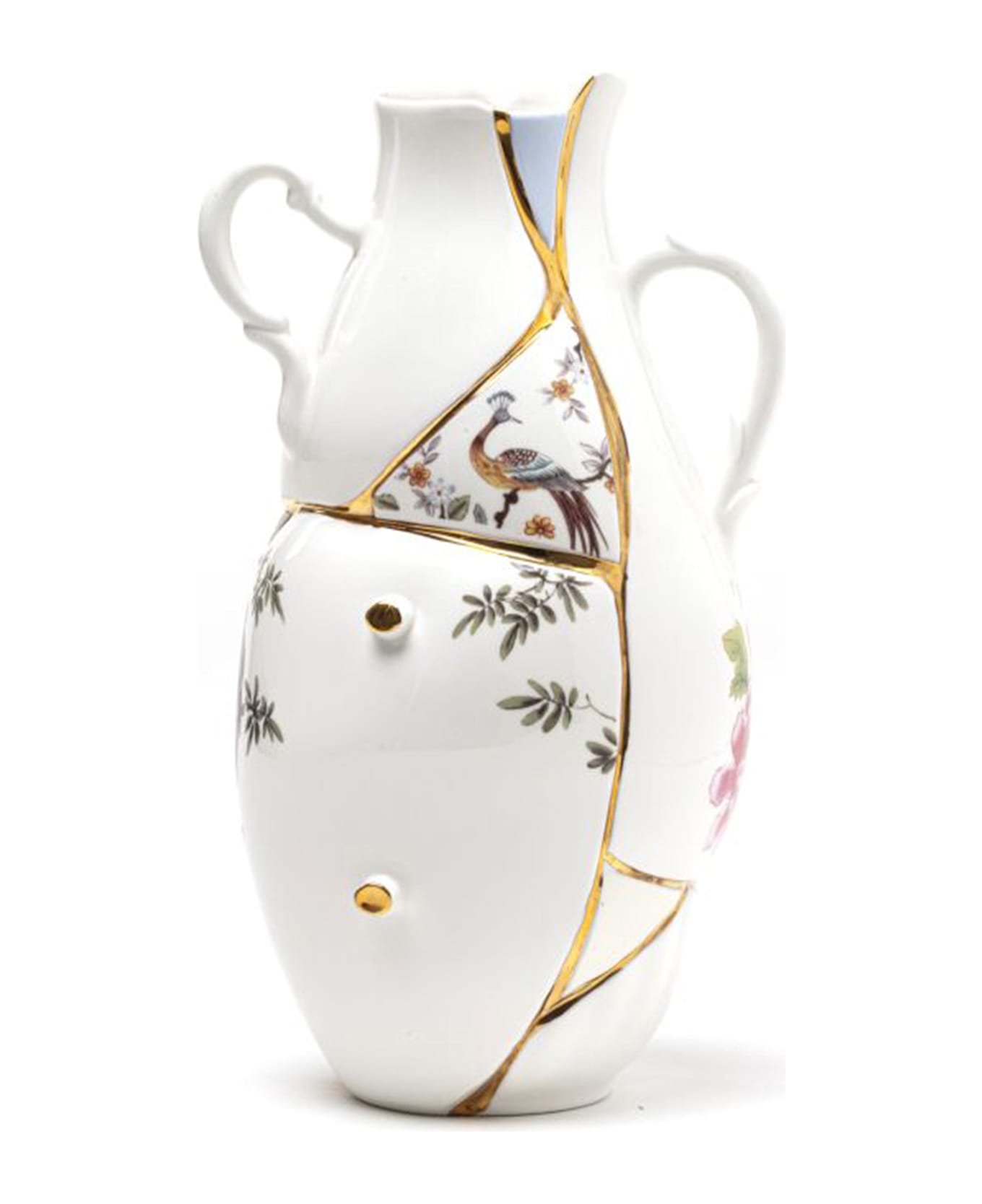 'Kintsugi' large porcelain and gold vase. 'L'arte giapponese Kintsugi assume forme contemporanee. La delicata porcellana viene glorificata e arricchita con frammenti d'oro per una collezione da tavola fatta di composizioni affascinanti e inaspettate. ' Design: Marcantonio