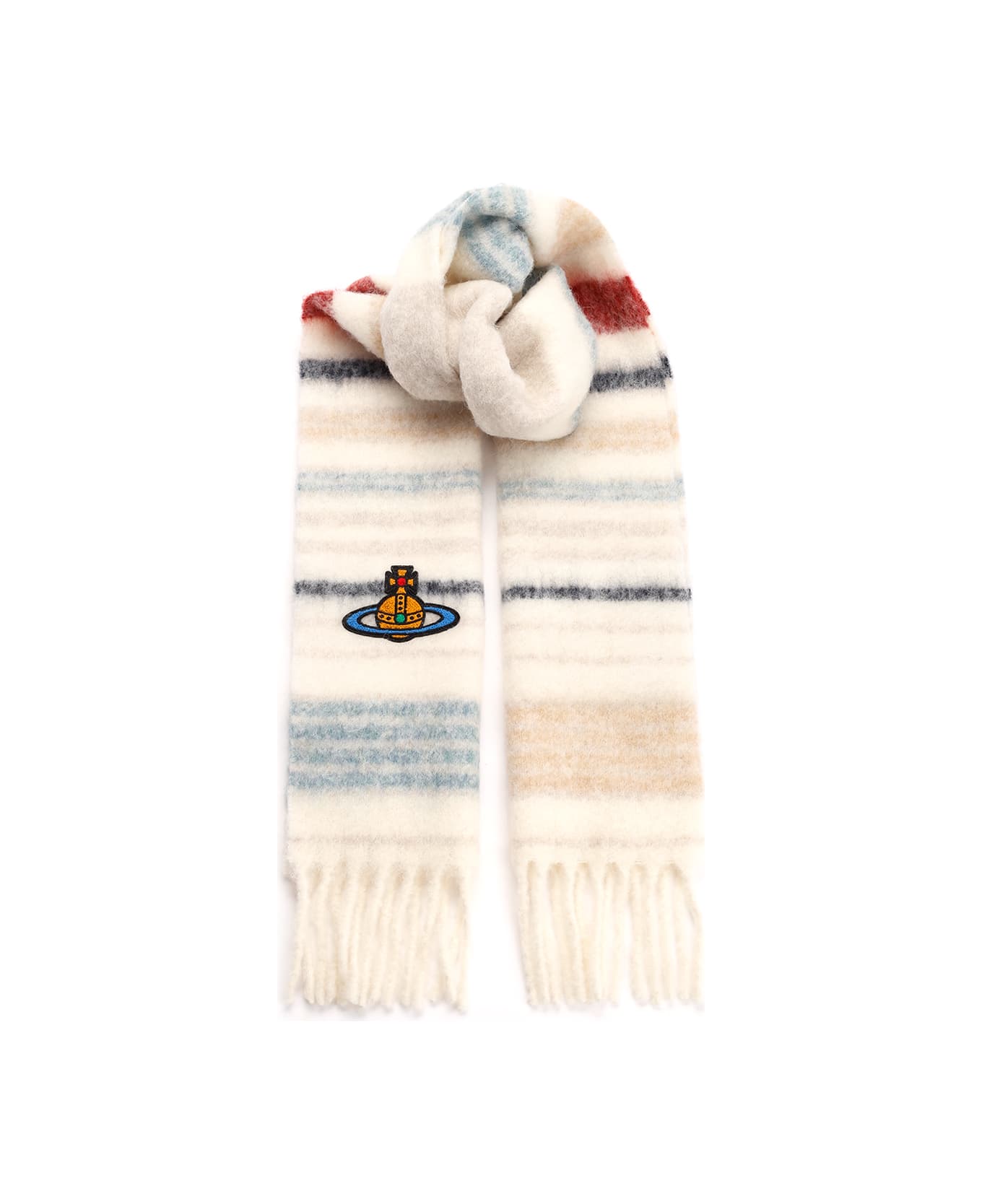 Green wool "Chunky" scarf with striped pattern by Vivienne Westwood with fringes and embroidered logo Composition: 60% WP 25% WO 15% PA