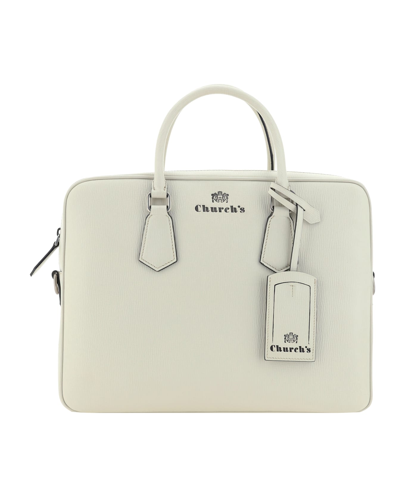 Leather business handbag by church's, two stiff tubular handles at top, zip-around closure at top, single interior compartment, removable luggage tag, adjustable and removable shoulder strap, iconic brand monogram press-stamped on front. Composition: 100% % Calf Leather Bos Taurus
