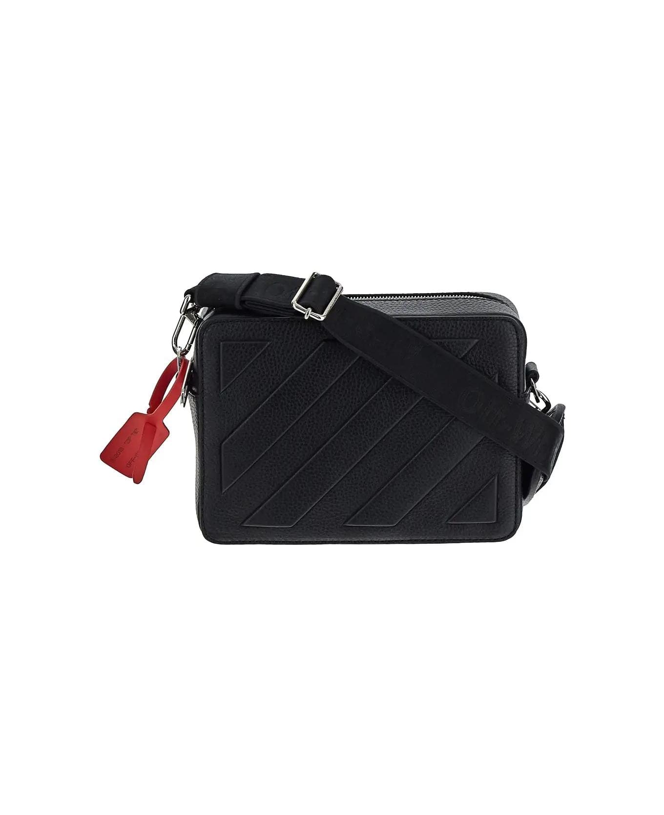 Off-White crossbody bag in black grained leather with embossed diagonals logo on one side, silver-finish metal logo, external open pocket, detachable and adjustable branded web shoulder strap with leather detail, detachable branded red leather label, top zip closure, a main compartment, a card slot and silver-toned metal hardware.