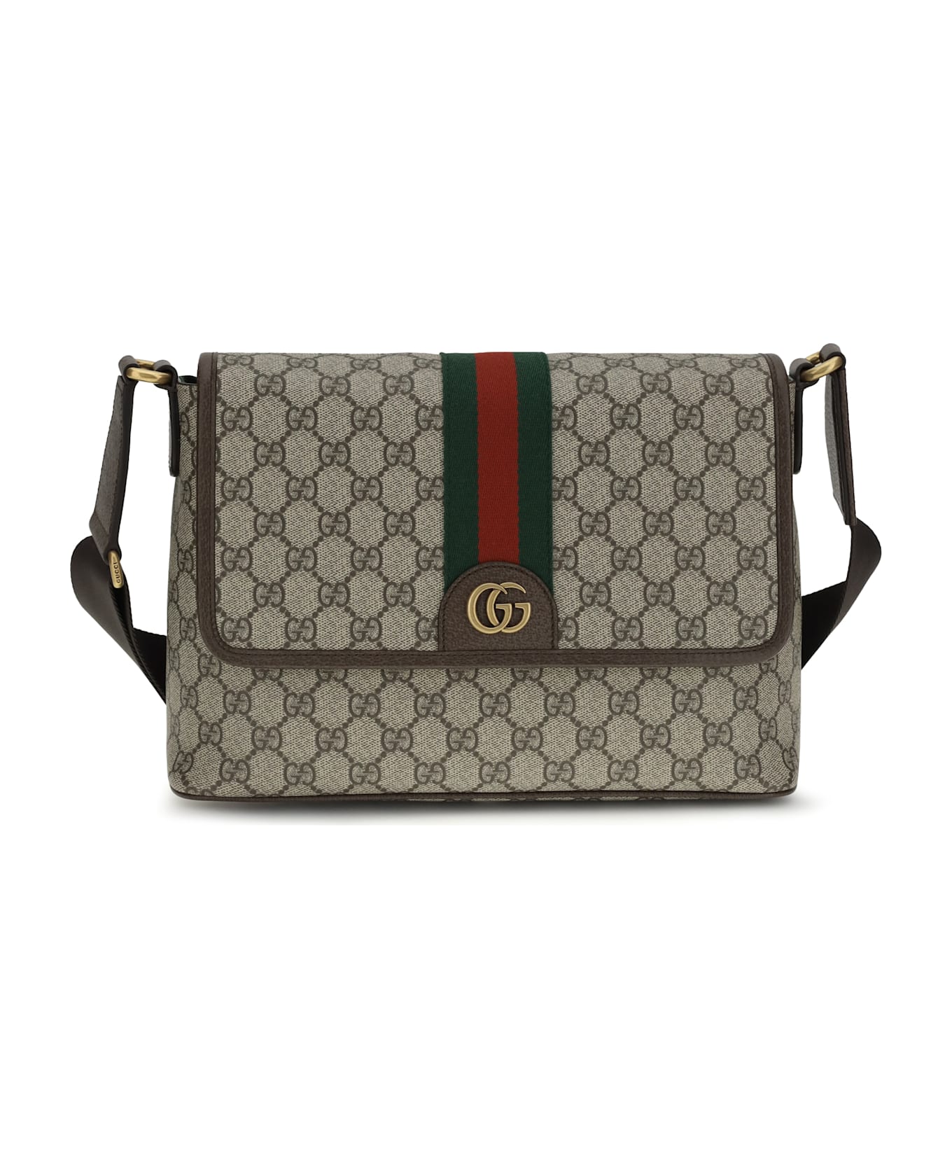 The medium ophidia shoulder bag by gucci is crafted from coated fabric featuring the classic gg monogram in beige and dark brown, with brown leather trim and gold-tone hardware. finished with a web detail and double g, it features an adjustable fabric shoulder strap, a flap closure, dark green linen and cotton lining, and an interior with a zip pocket and an open pocket, combining iconic elegance with everyday functionality.