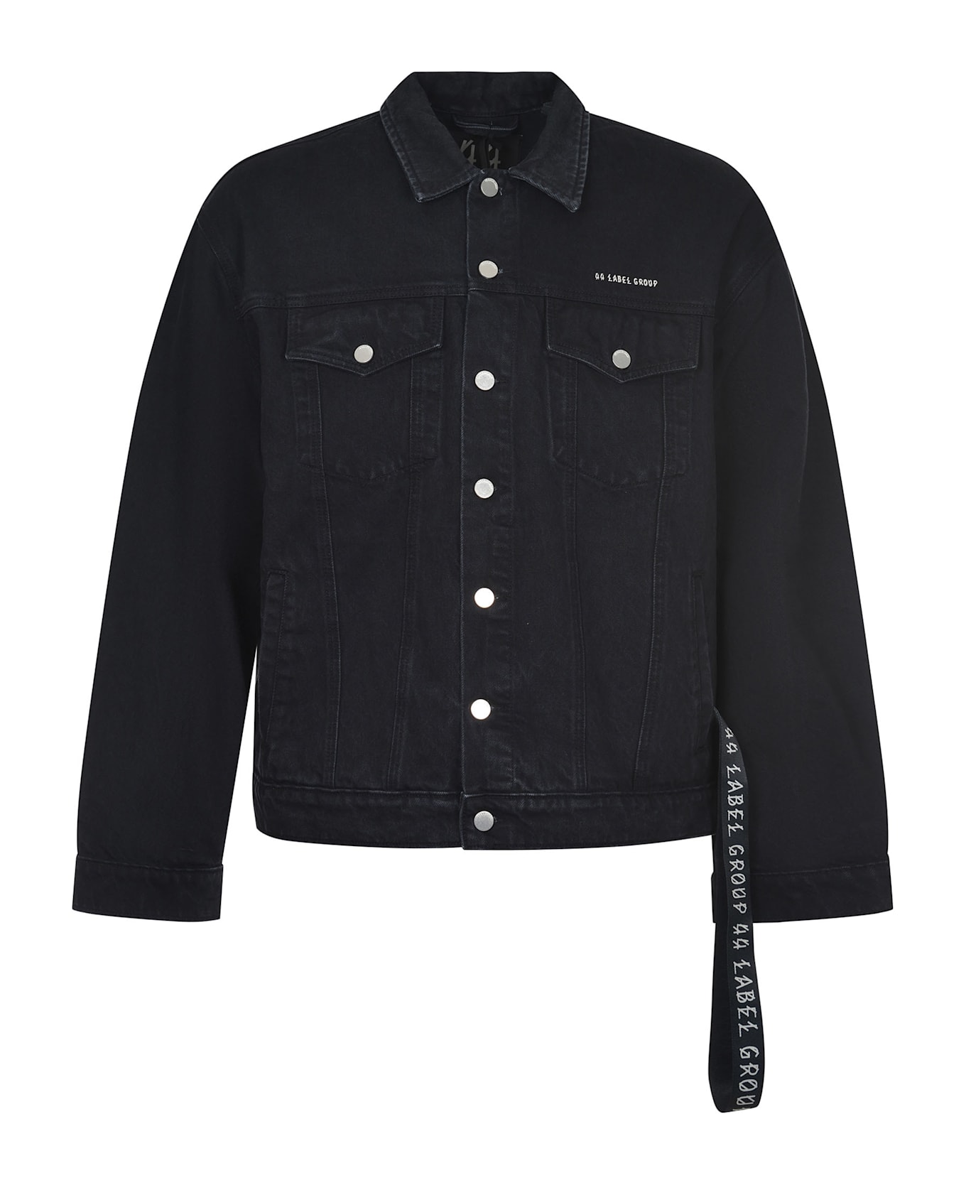 44 Label Group jacket made of black denim. Sleeves. Shirt collar. Buttoned cuffs Button closure on the front. Chest pockets with flap and button. Contrasting logo lettering on the chest. Side pockets. Removable logoed side lace. Maxi contrasting logo print on the back. 100% cotton