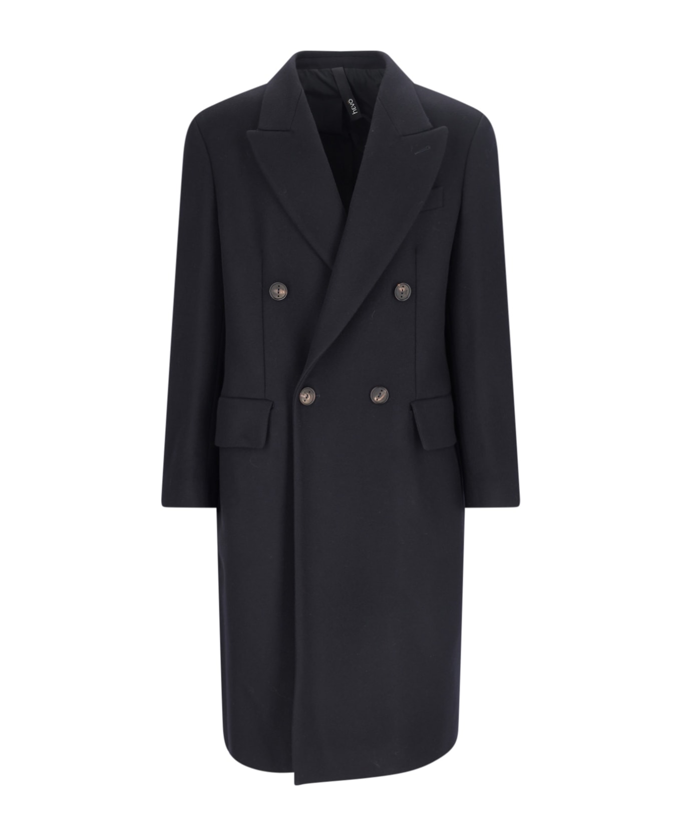 Hevò Martina double-breasted coat, in blue virgin wool blend, navy tone, peaked lapels, button fastening, button cuffs, chest pocket, two front flap pockets, central back vent, straight hem.