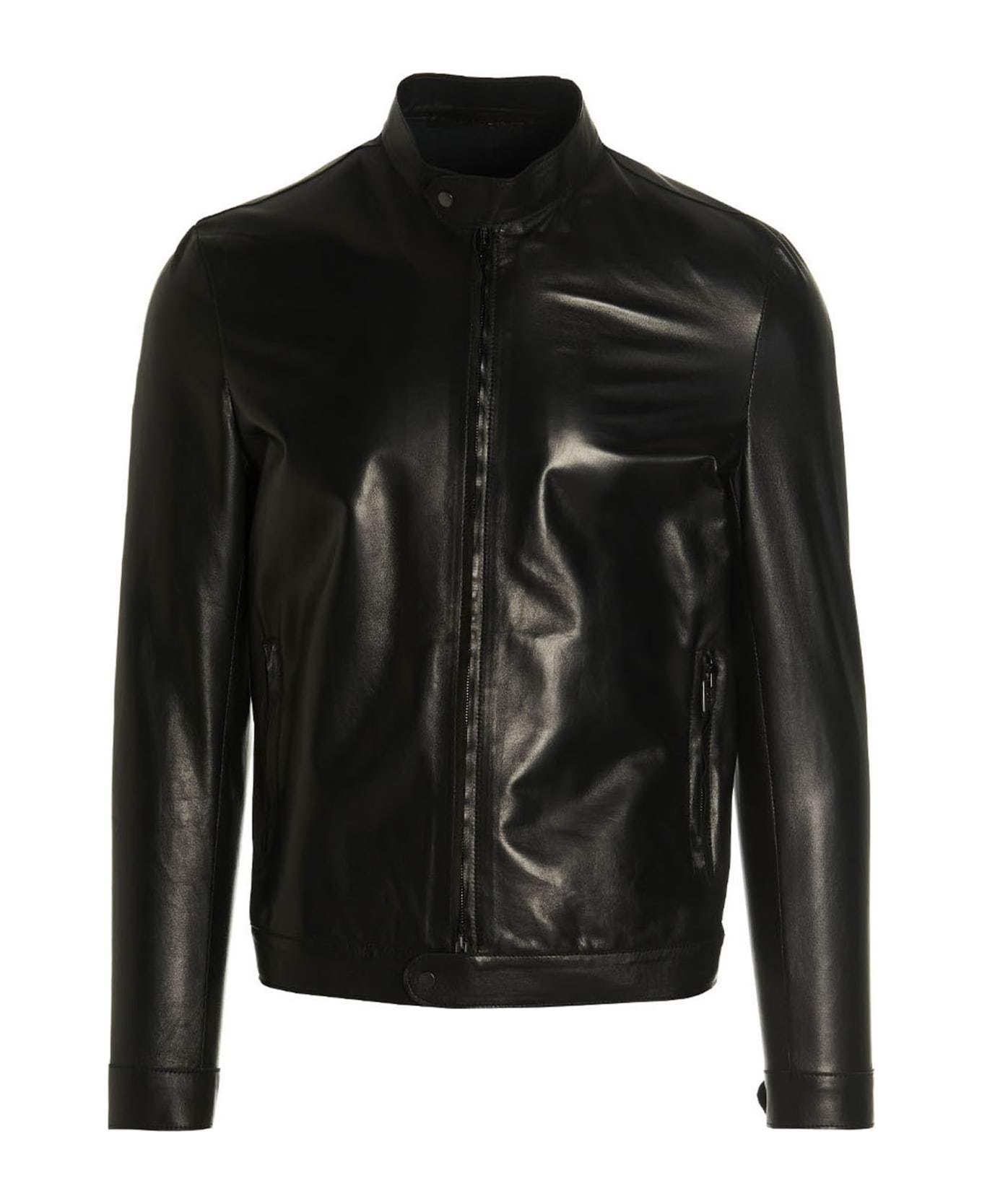 Nappa biker jacket with zip closure, crewneck, button, pockets and long cuffed sleeves.