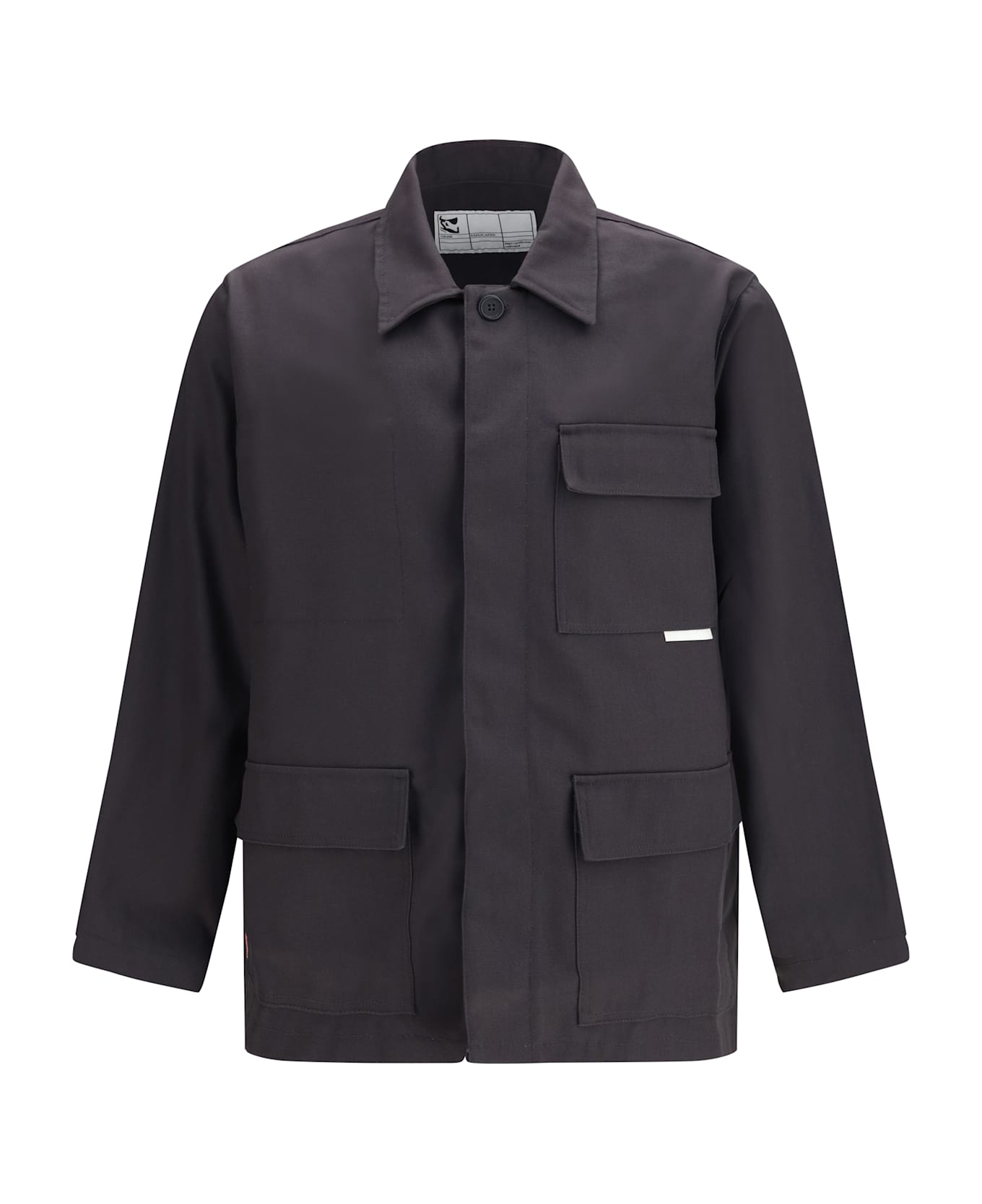 The jacket by gr10k features a classic collar and concealed front button fastening for a clean, minimal aesthetic. it is designed with flap chest pockets and long sleeves, functional details that enhance its contemporary character.
