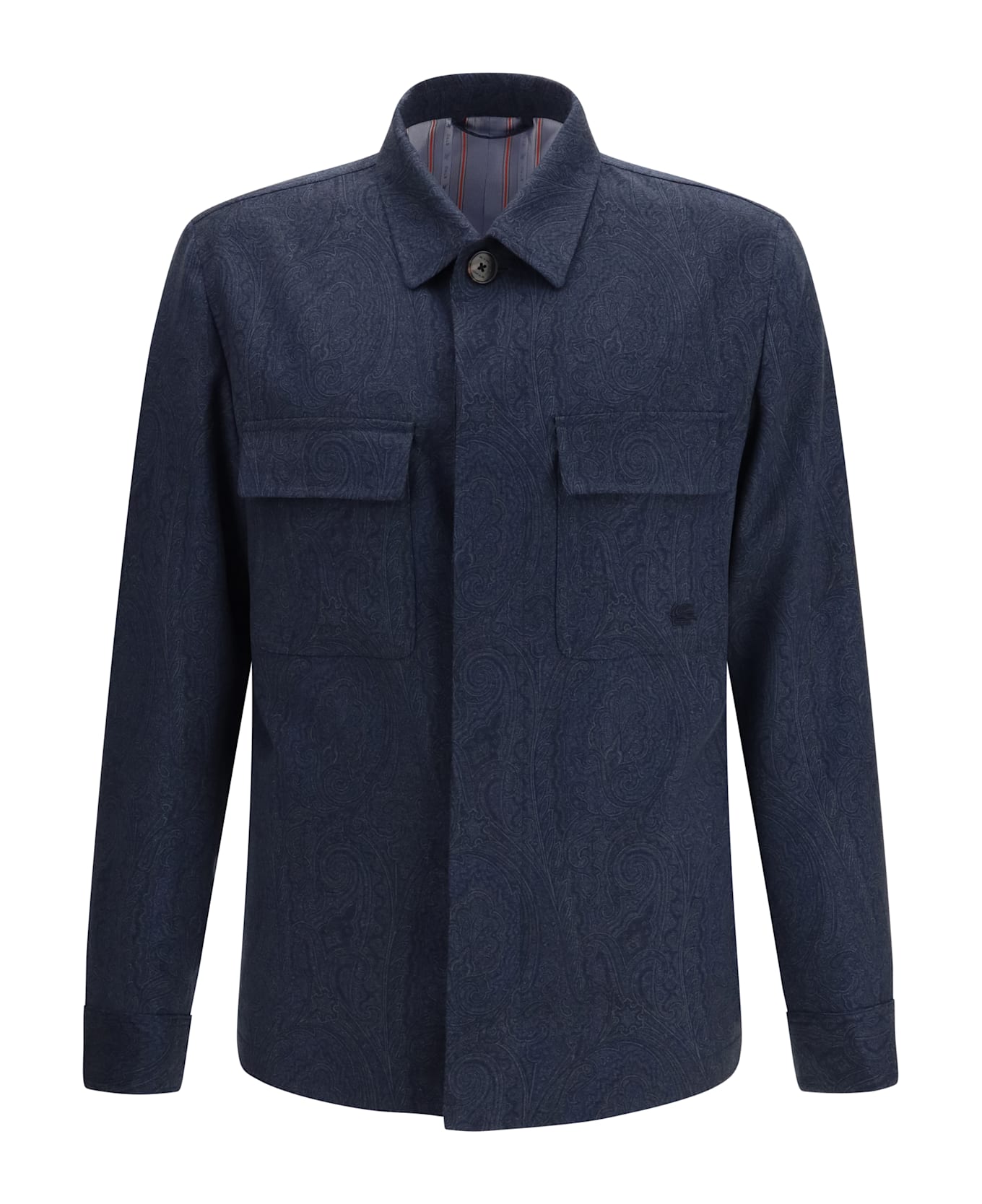 The pure wool shacket by etro elevates the classic shirt-jacket through a refined design enriched with the iconic all-over paisley motif. the piece features two front patch pockets, one finished with a subtle tone-on-tone embroidered pegaso, a signature detail of the house. the concealed button closure, with the first button left visible and adorned with the etro logo, adds a touch of understated elegance. completed with a pointed collar, working cuffs, and an easy fit, this shacket offers a versatile and sophisticated option for contemporary styling.