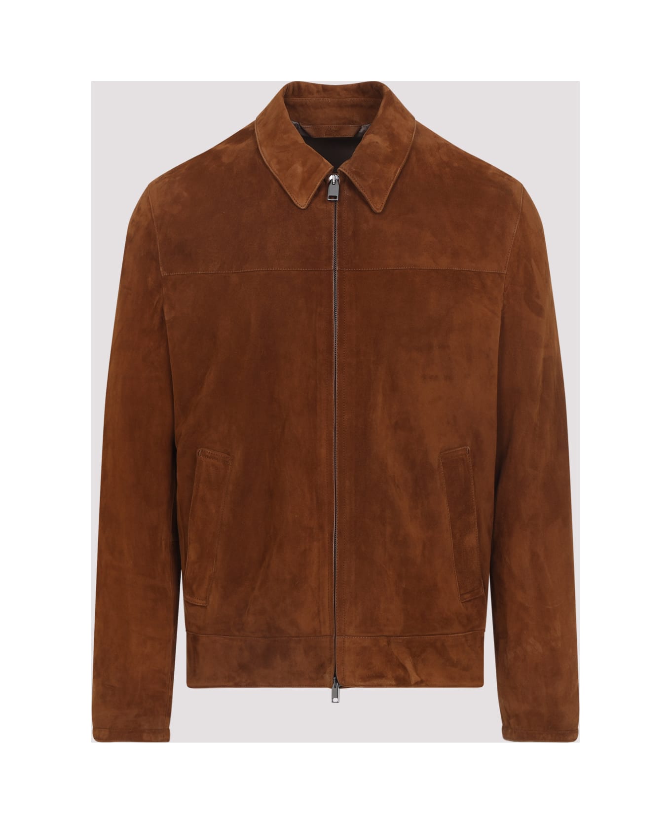 Brioni Brown Suede Leather Jacket. Crafted from brown suede leather featuring a pointed collar, a front zip fastening, long sleeves, a straight hem, and a full lining.