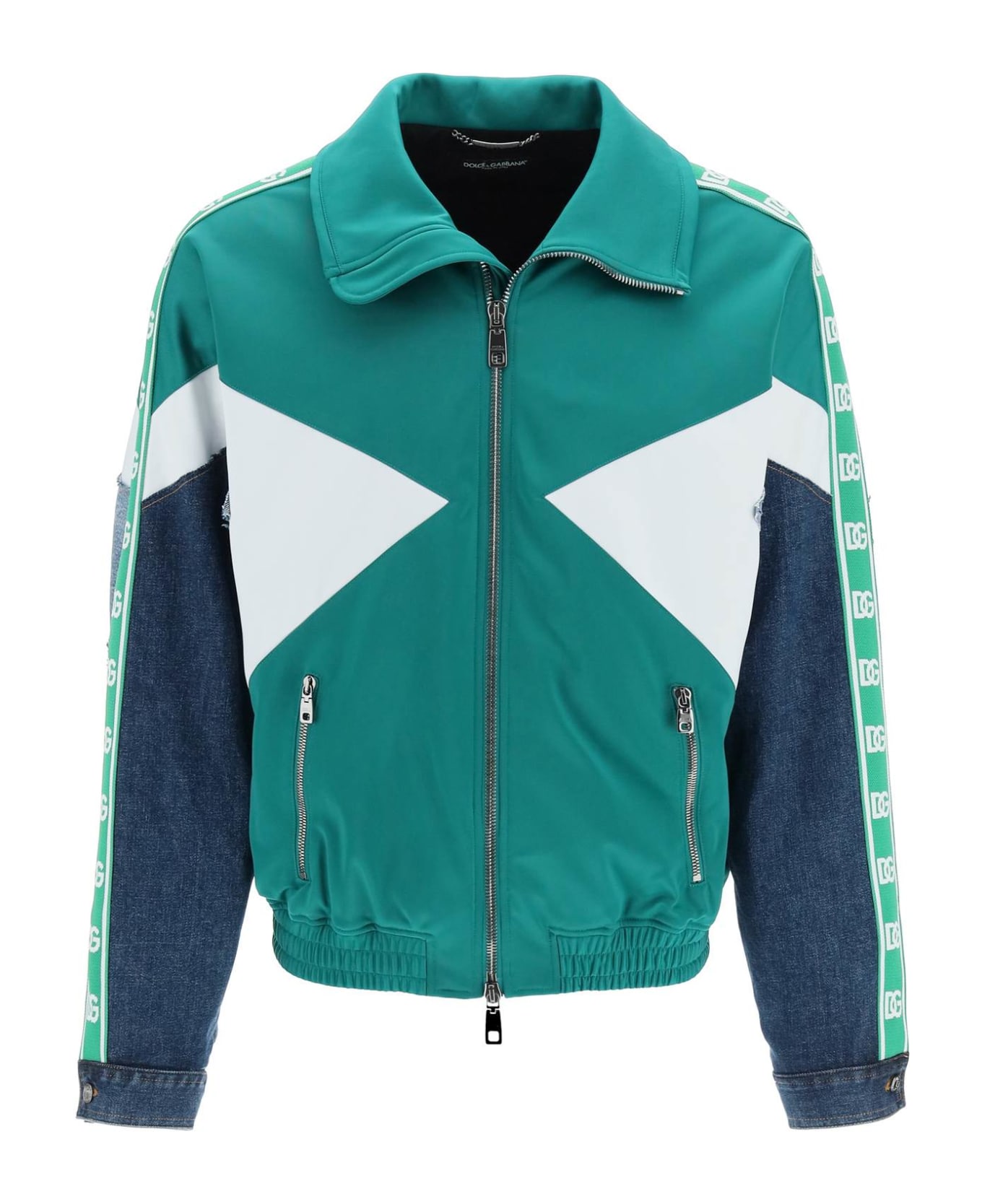 Dolce & Gabbana zip-up track jacket made of color-block technical jersey with denim patchwork inserts. Enriched by sleeve logo bands, it features a stand collar, a double-slider zip closure, zip pockets, elasticated hem, and buttoned cuffs. Mesh lining, one inside pocket. Oversized fit. The model is 187 cm tall and wears a size M.