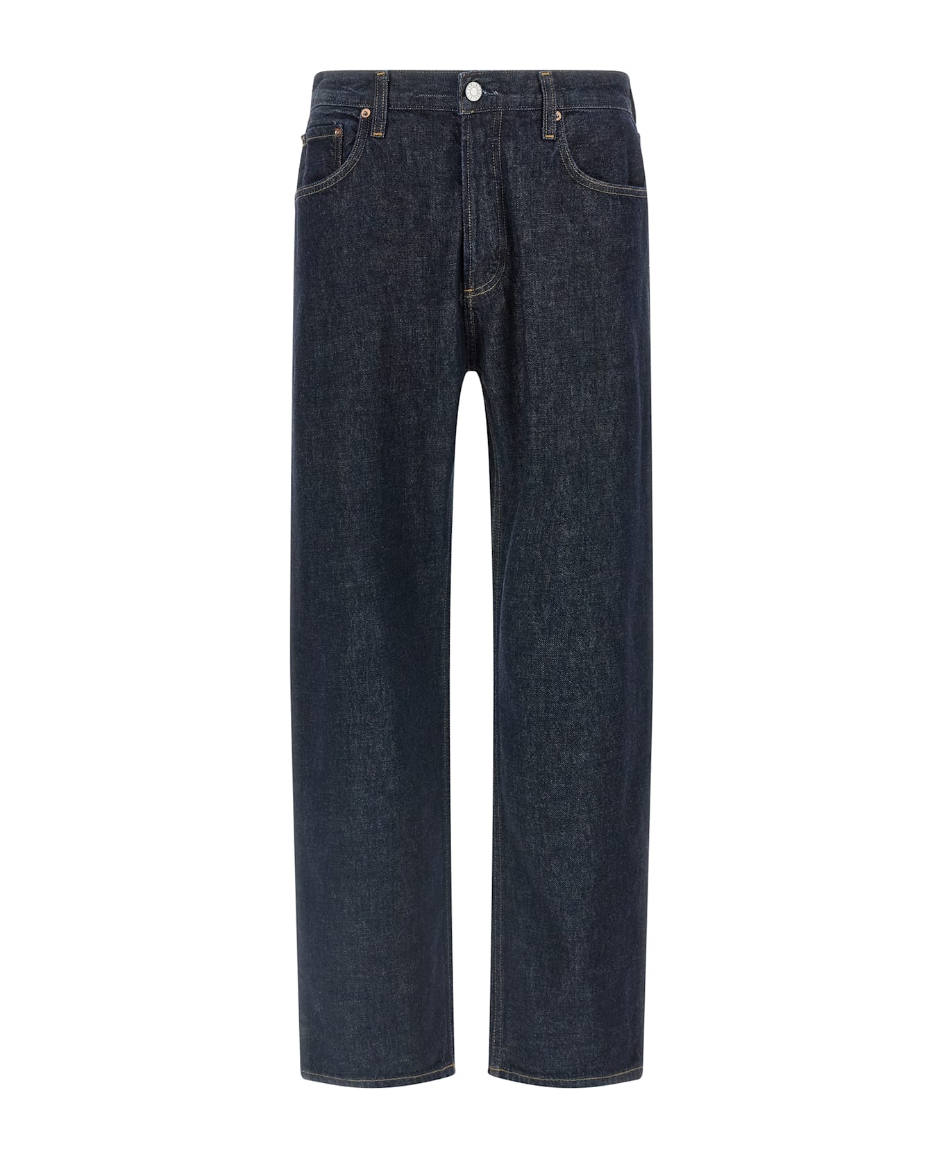 'Magnus' jeans in Rinse washed cotton denim with contrast stitching, wide straight leg, front button closure, five pockets. SUSTAINABLE: Product made with recycled materials.