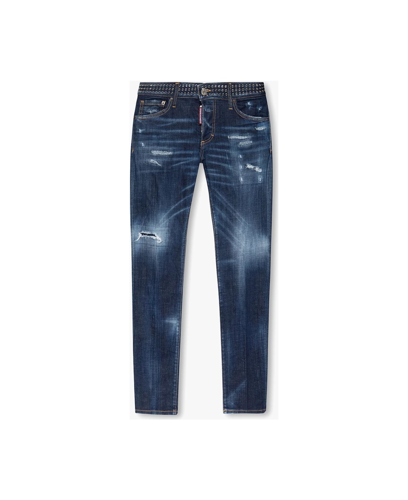 Navy blue 'Sexy Dean' jeans from Dsquared2. Made of cotton with a vintage effect, this pair falls with tapered legs and features button fastenings, classic five pockets and stud embellishments.