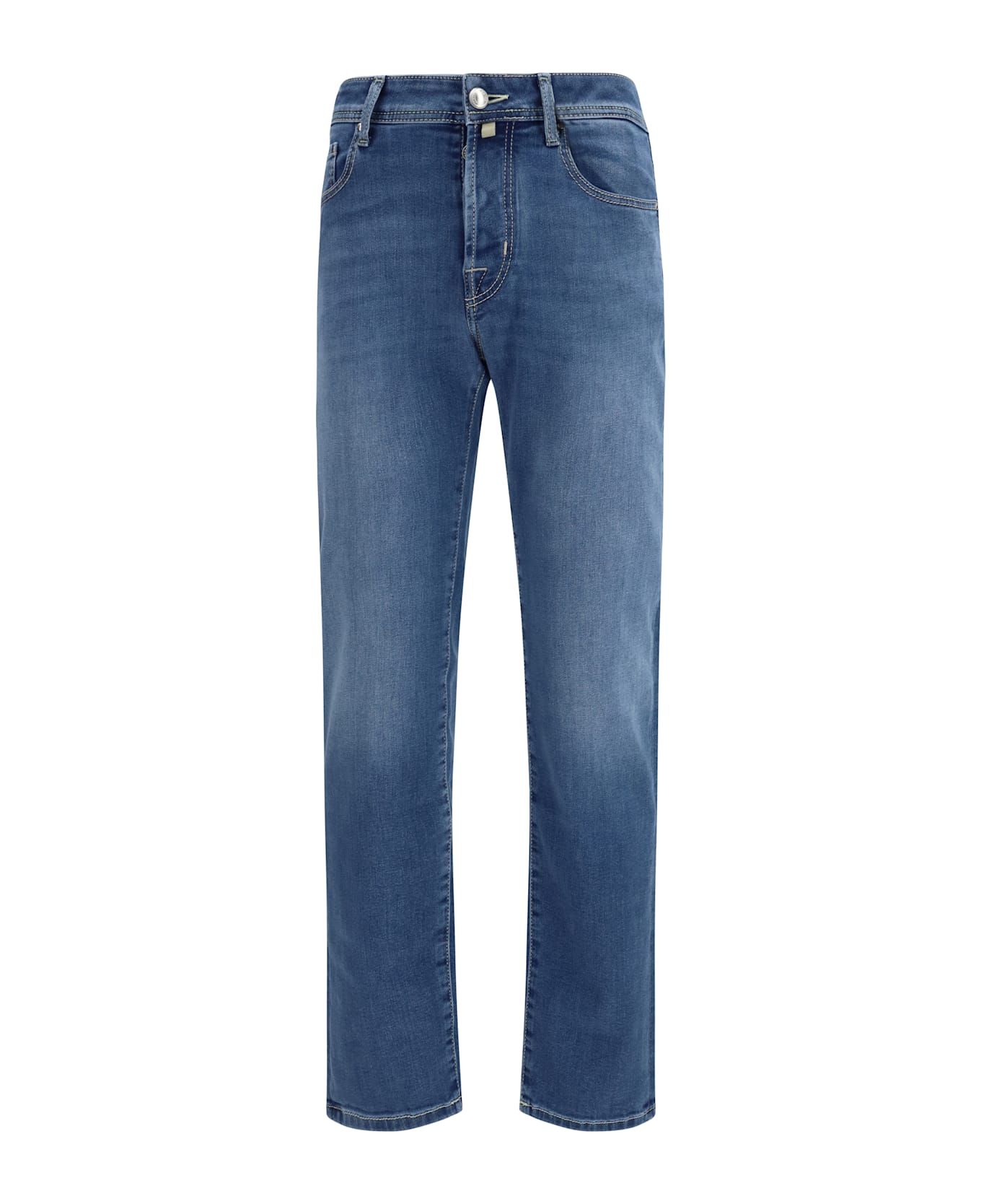 The slim fit jeans by jacob cohën reinterpret the classic five-pocket design with a refined and versatile attitude. the regular fit ensures comfort and ease of movement, while the high-quality denim with a subtly worn finish adds character. the metal logo button with concealed zip highlights the attention to detail, completed by the signature bandana, a distinctive hallmark of the brand.