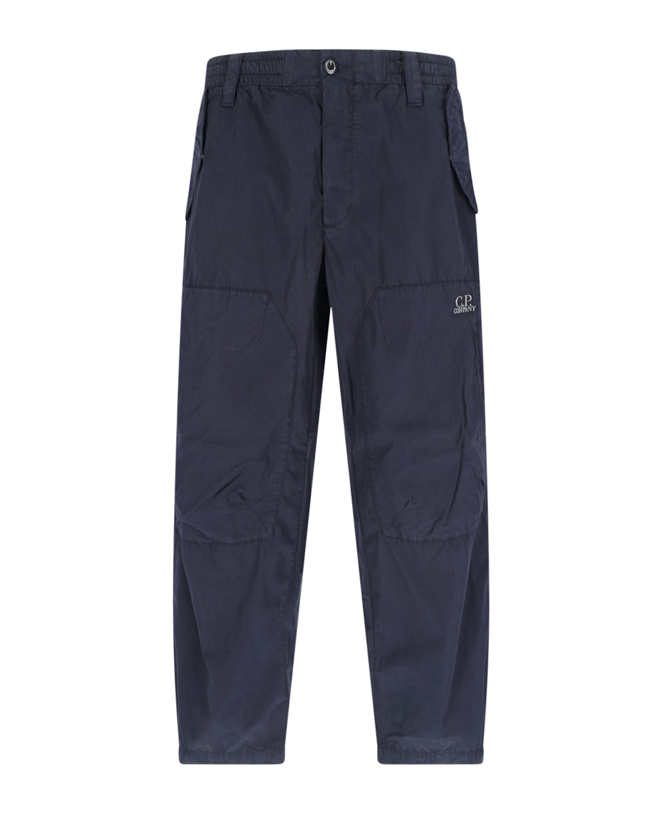 C. P. Company logo wide pants in navy blue cotton with mid elastic waistband, belt loops, button and zip drawstring closure, two side button flap pockets, two side zip pockets, white logo embroidery detail, back flat pocket, logo label detail, elastic details at the hem, wide leg.