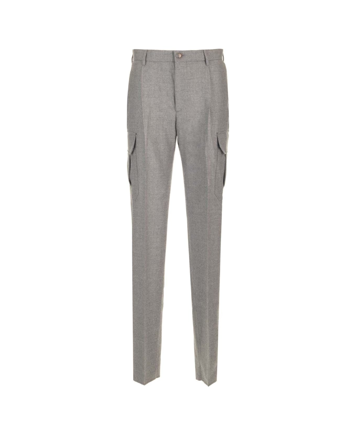 Grey stretch wool cargo trousers by Tagliatore with two side patch pockets, two welt pockets and zip and button fastening.