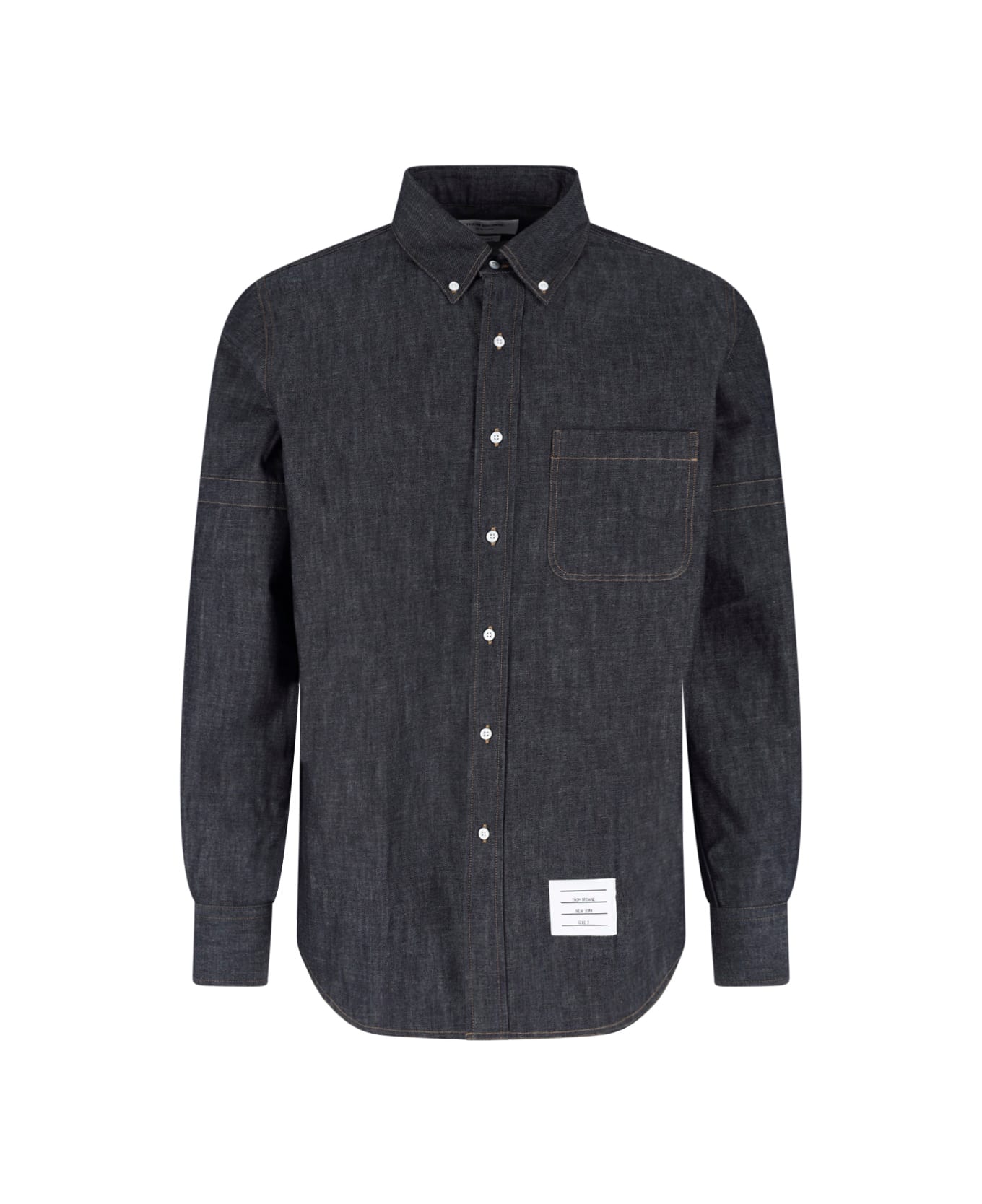Thom Browne 'Armband' dark blue cotton denim shirt with button-down collar, chest patch pocket, button closure, logo label on the front, button cuffs, multicolor striped loop detail on the back, button detail sleeves at the back, curved hem. Composition: 100% Cotton