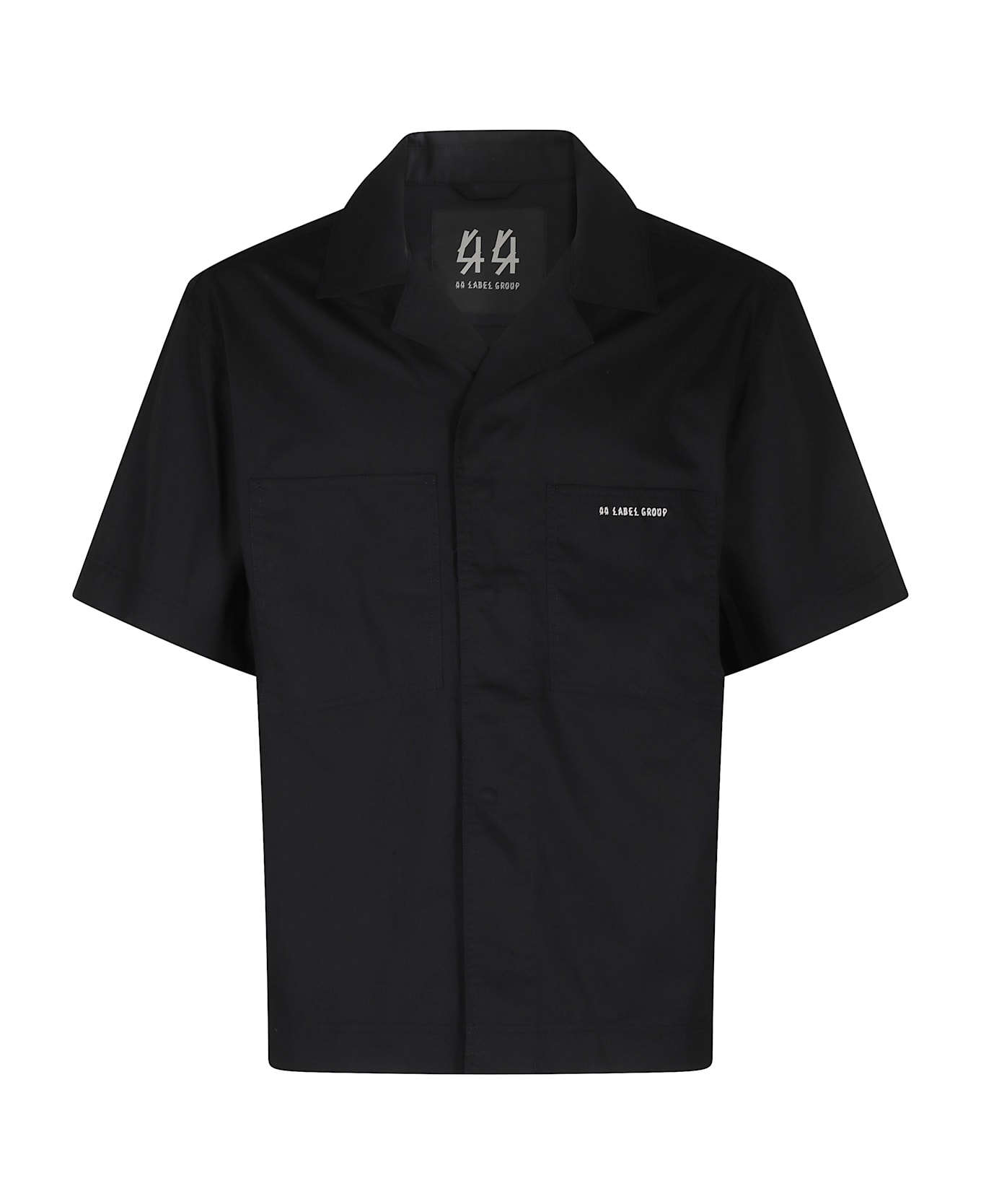 Backstage shirt - 44 Label Group - Black color - Pointed collar - Short sleeve - Patch pocket with printed logo - Contrast back print - Concealed front closure - Over fit