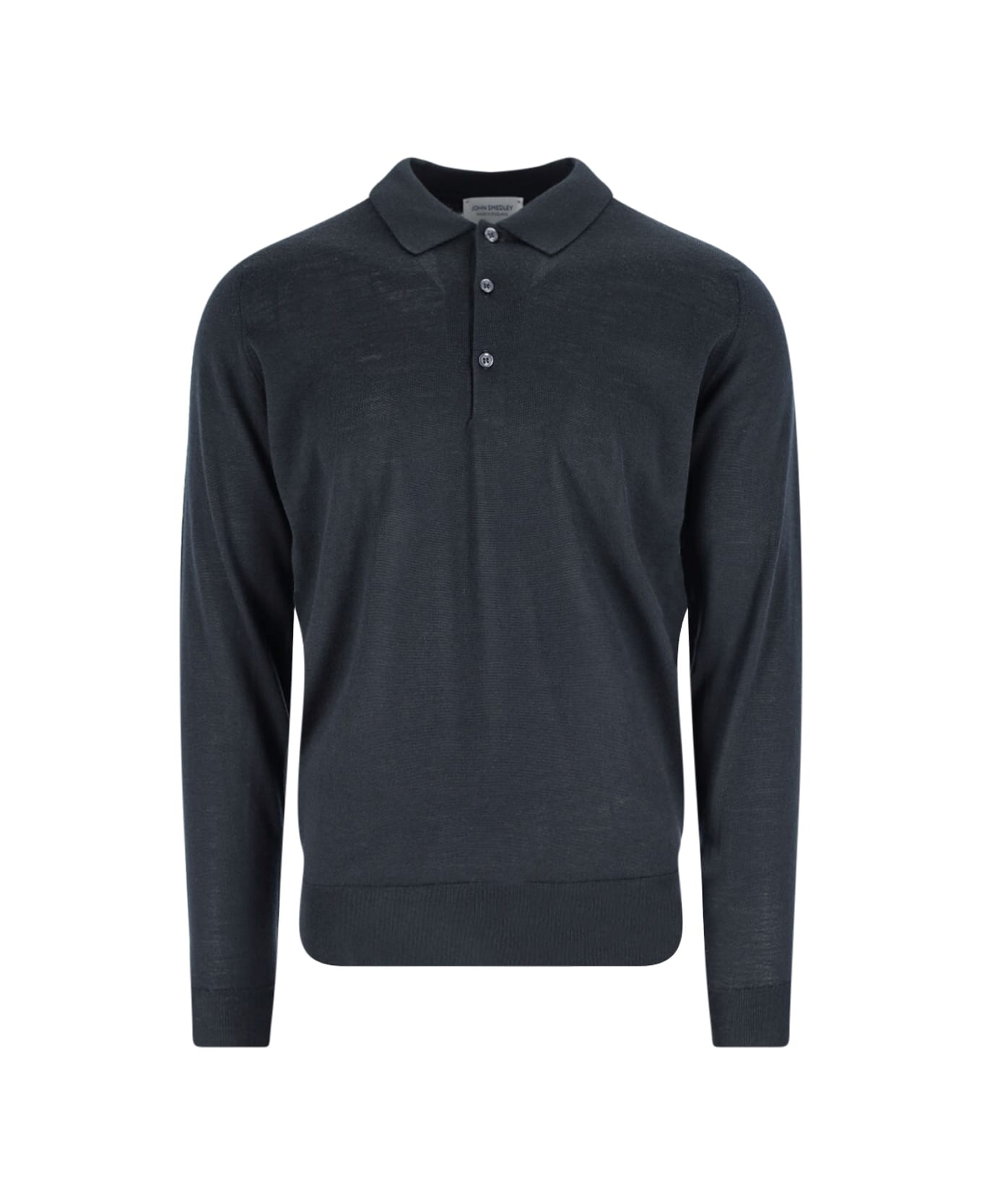 John Smedley 'Bepler' polo shirt in black extrafine merino wool with classic collar, button closure, ribbed trims, straight hem.