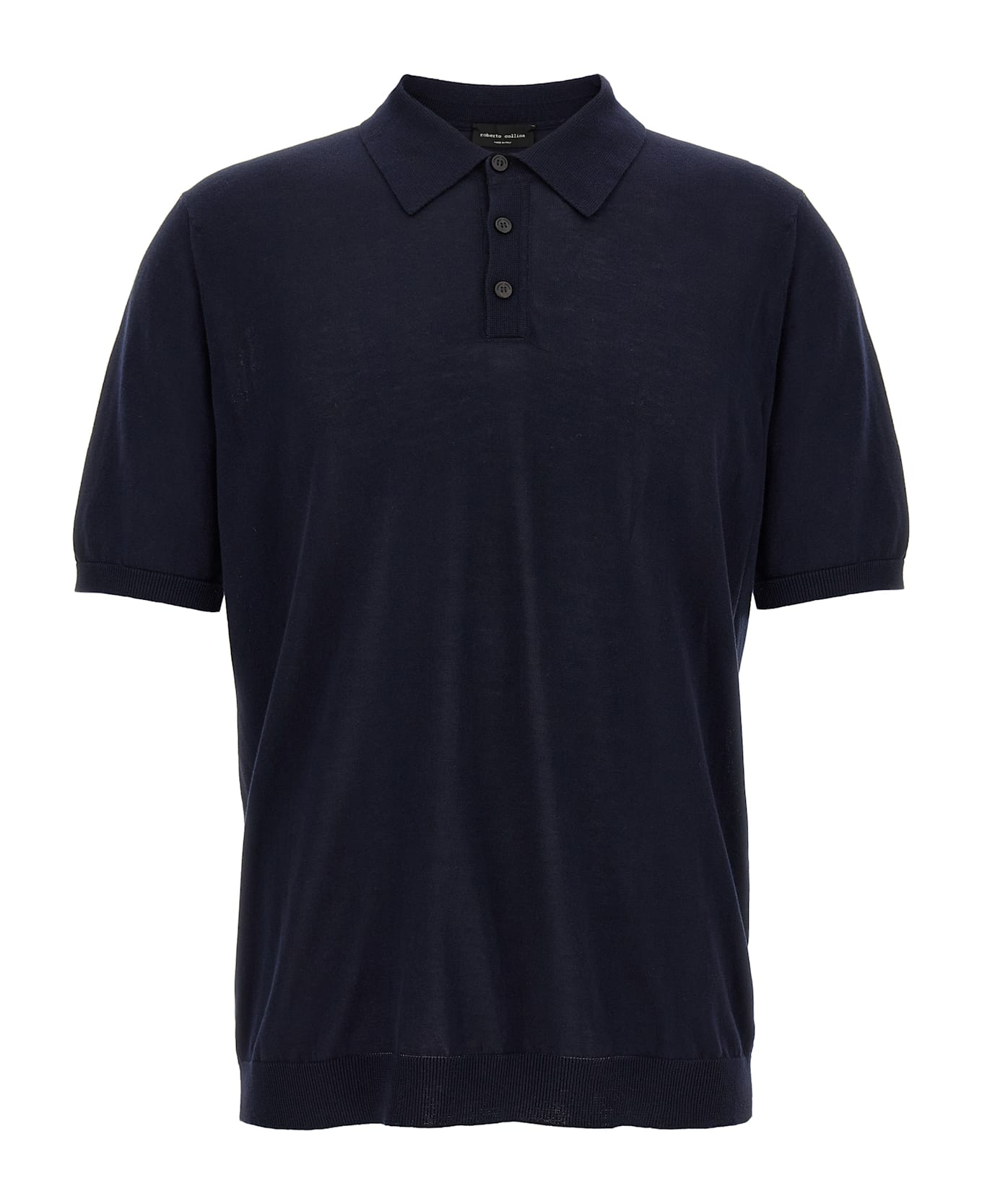 Cotton knit polo shirt, collar, three button closure, short sleeves.