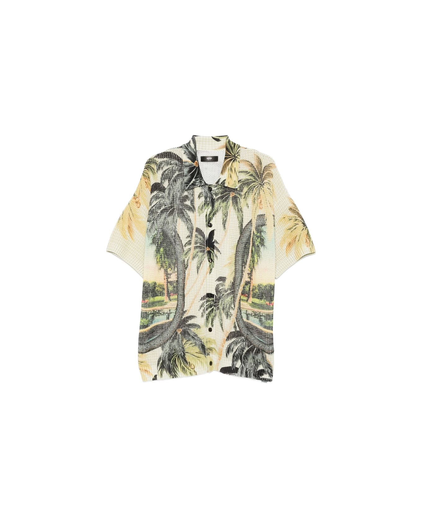green palm-tree print knitted texture button fastening short sleeves ribbed trim