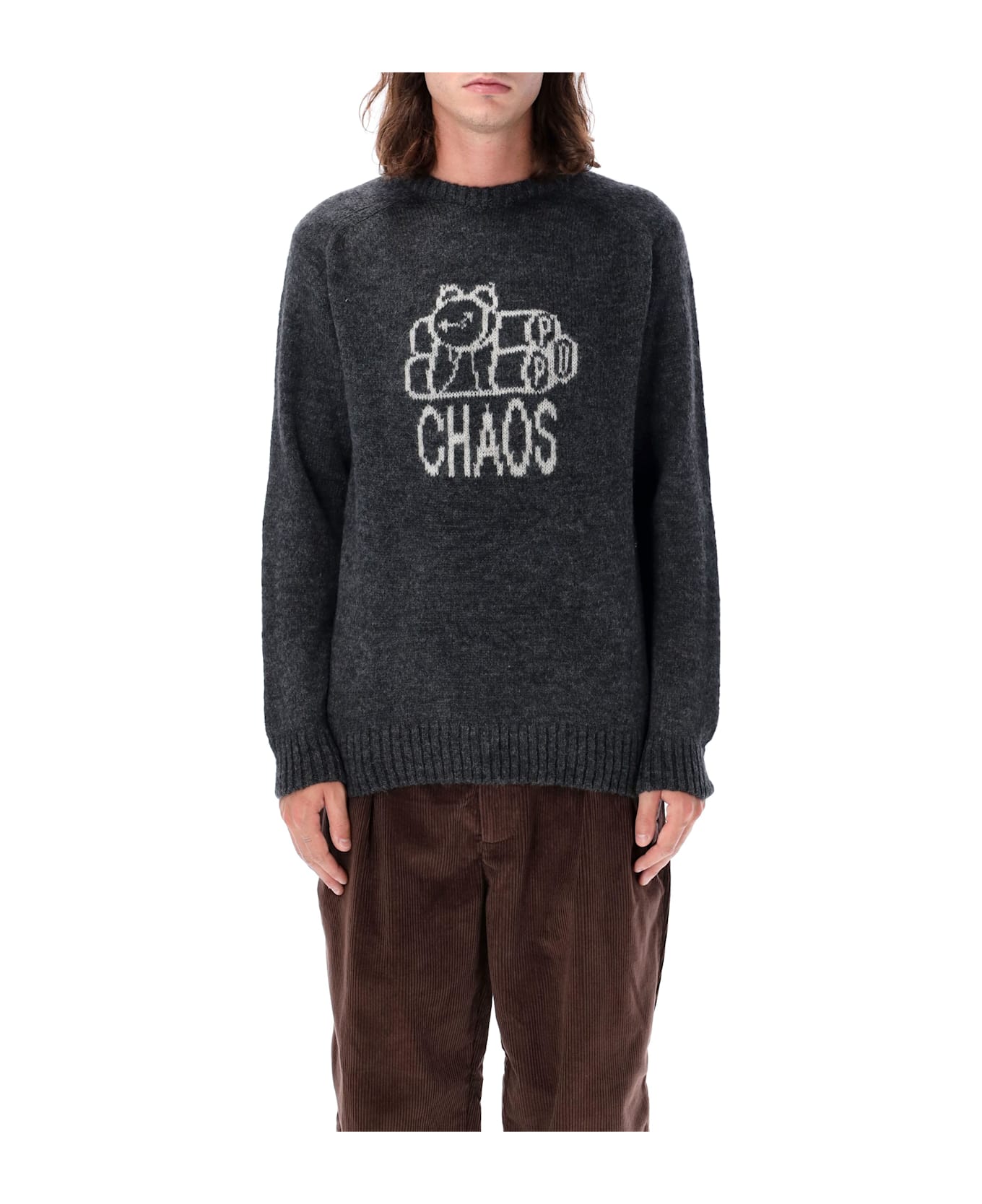 Chaos Sweater By Pop Trading Company. Featuring: Regular Fit Wool-blend Fabric Crewneck Design Long Sleeves With Ribbed Cuffs "chaos" Graphic And Playful Illustration On The Front Ribbed Hem Model Is 1,90m And Wears Size L.