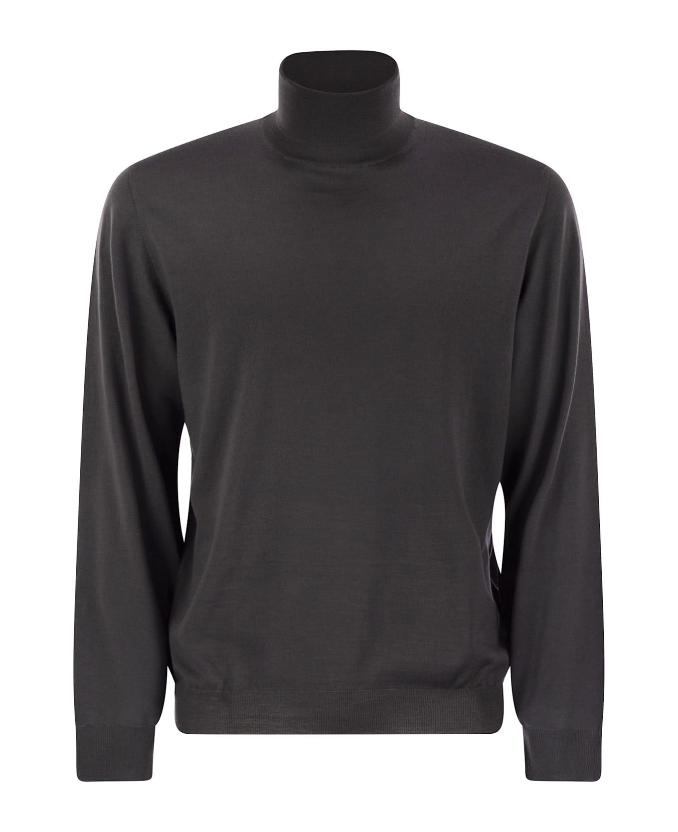 High-neck jumper with tailored sleeves, creating a refined and well-fitting look. Made from a single layer of ultra-light Wool 140, it offers the ideal combination of warmth and comfort. The 18-gauge plain knit gives it a light and elegant appearance. - Turtleneck - Tailored sleeves - Single layer - Stockinette stitch - 18 gauge - 100% Wool 140 DESIGNER ID: MU007013 39 Composition: 100% Virgin wool