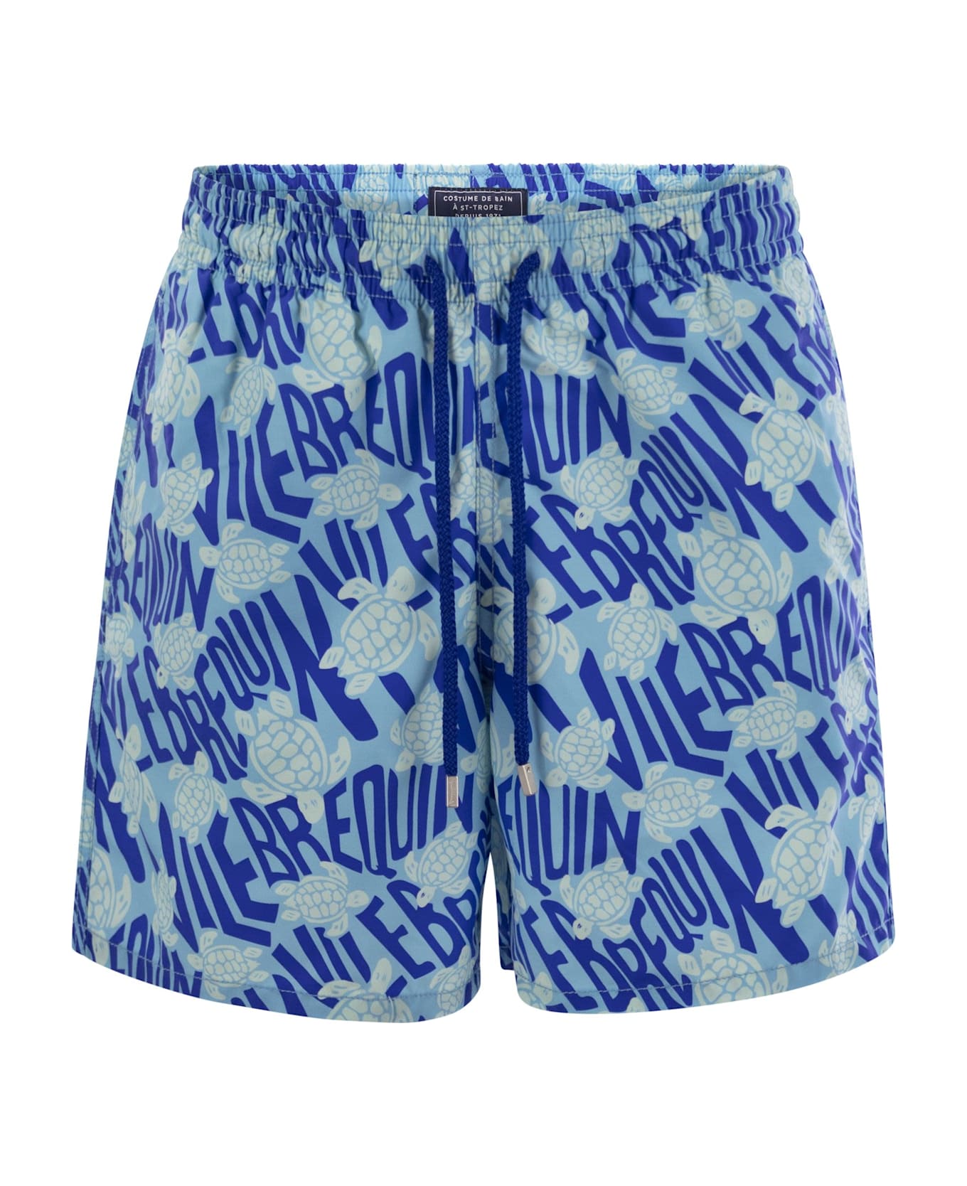 Dive into summer with these recycled polyamide beach shorts, featuring a comfortable elastic waistband, a distinctive drawstring with zamak ends, and an original Vilebrequin turtle print. - Swimsuit with elasticated waistband and drawstring with Vilebrequin logo engraved on zamak ends - Side pockets - Hand-sewn back pocket for perfect visual continuity with the swimsuit print - Two back grommets allow water to drain away to reduce the balloon effect when exiting the water - Integral water-resistant mesh lining (100% polyamide) - Fabrics are treated for quick drying DESIGNER ID: MOOCB112 612