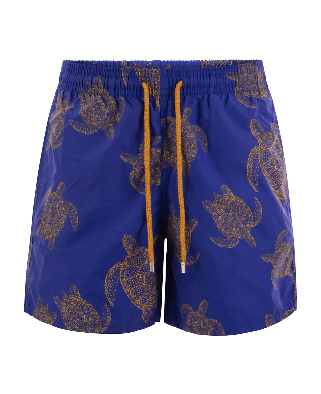 Decorated with turtles swimming against a Marrakech blue background, these recycled polyamide swim shorts feature a comfortable elasticated waistband and a distinctive drawstring with zamak ends. - Swimsuit with elastic waistband and drawstring with Vilebrequin logo engraved on zamak ends - Side pockets - Hand-sewn back pocket for perfect visual continuity with the swimsuit print - Two back grommets allow water to drain away to reduce the balloon effect when exiting the water - Integral water-resistant mesh lining (100% polyamide) - Fabrics are treated for quick drying DESIGNER ID: MOOCB105 613