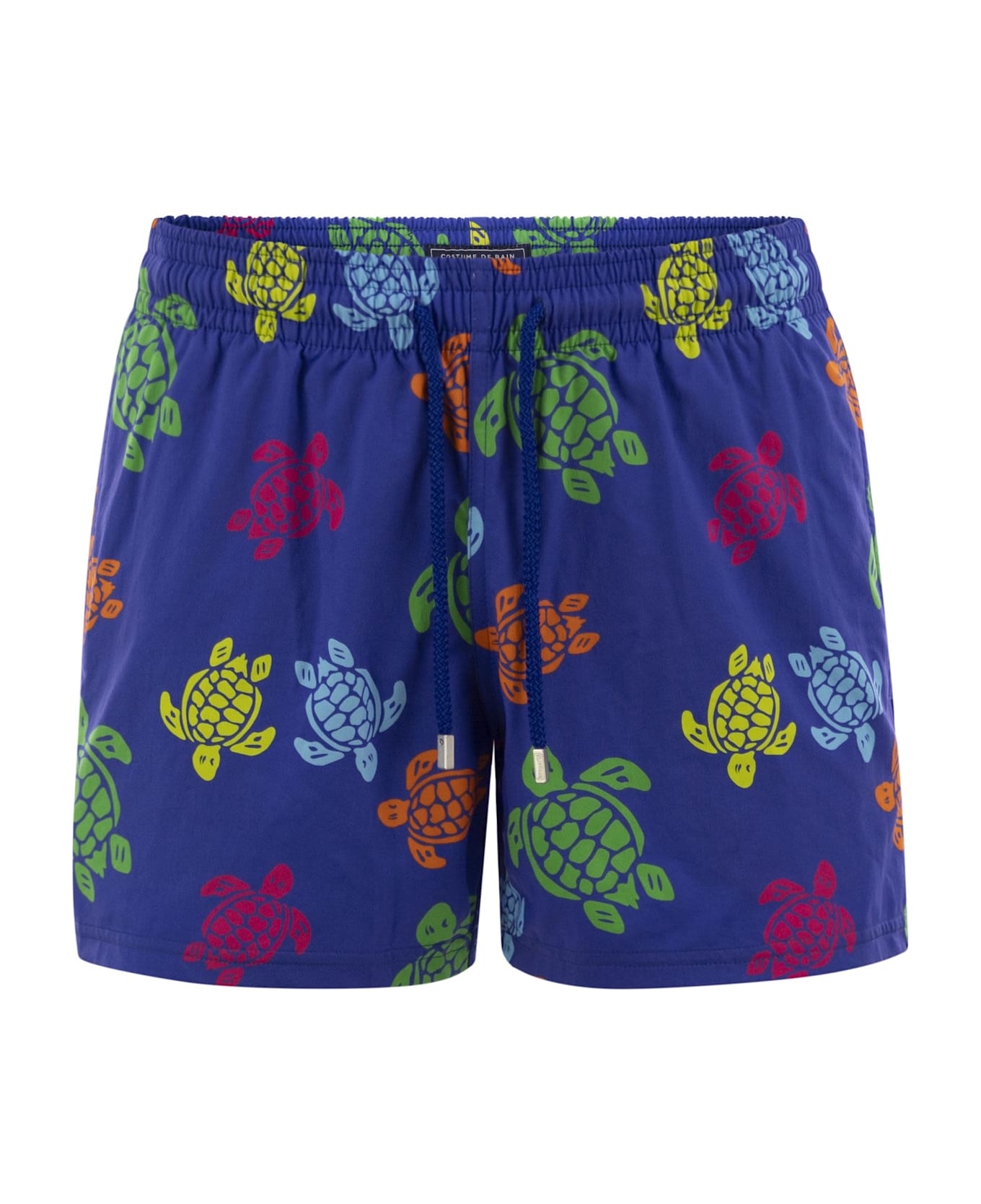 These short-cut shorts are made of comfortable, recycled stretch polyamide and elastane and are perfect for relaxed summer days. - Shorts with a shorter cut in stretch fabric - Elasticated waistband with drawstring and zamak ends with Vilebrequin engraving - Two side pockets and one couture back pocket with Velcro fastening - Two rear grommets allow water to drain away and reduce the balloon effect when emerging from the water - Leg length in size M: 36. 8 cm - slightly shorter than the classic Moorea model DESIGNER ID: MSOCF136 613