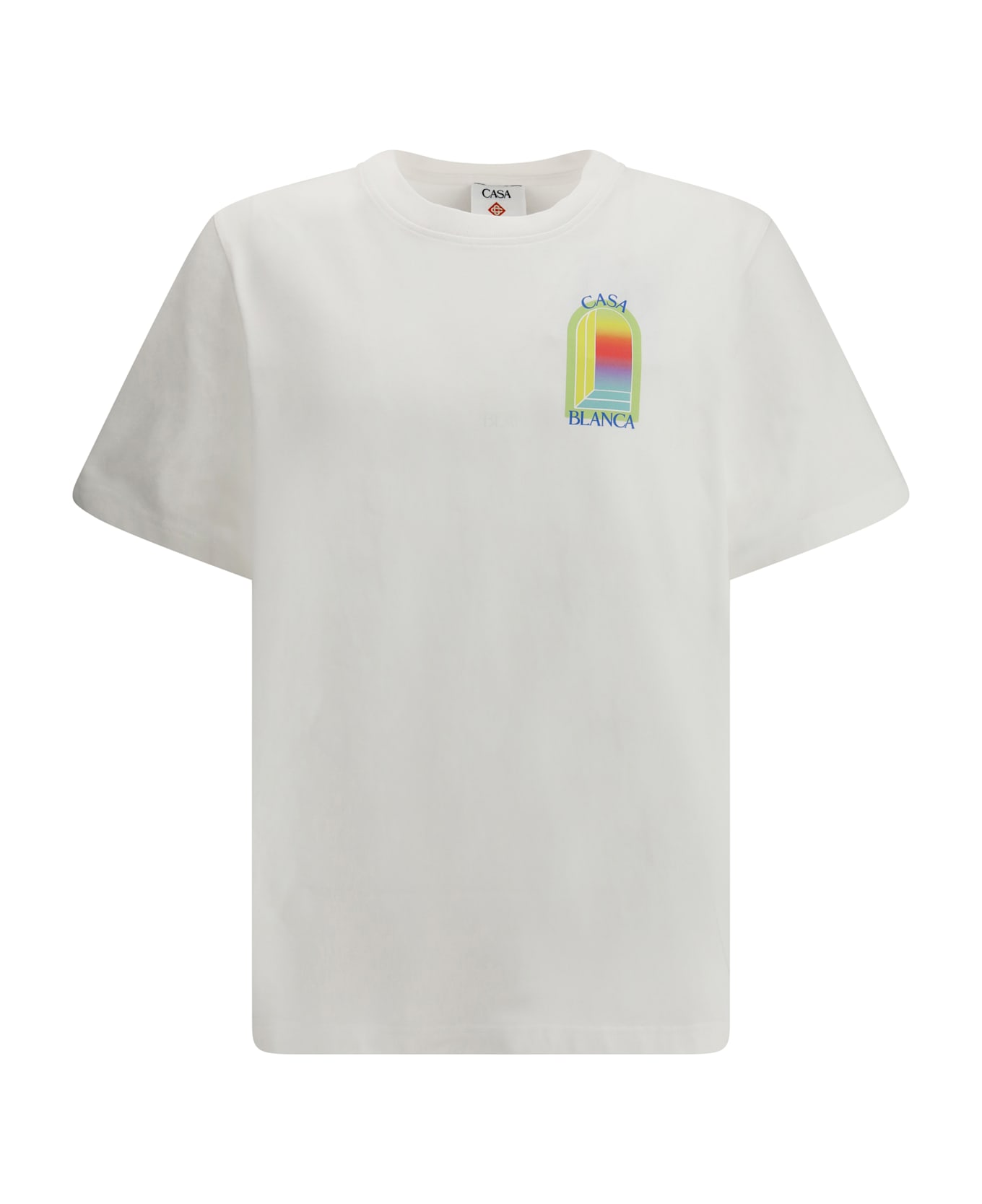 The l'arche t-shirt by casablanca is a short-sleeve design crafted from organic cotton, featuring the signature screen-printed arch artwork, an abstract symbol of strength. the piece is finished with a classic ribbed crew neckline and a clean silhouette enhanced by the soft printed cotton fabric. Composition: 100% % Cotton