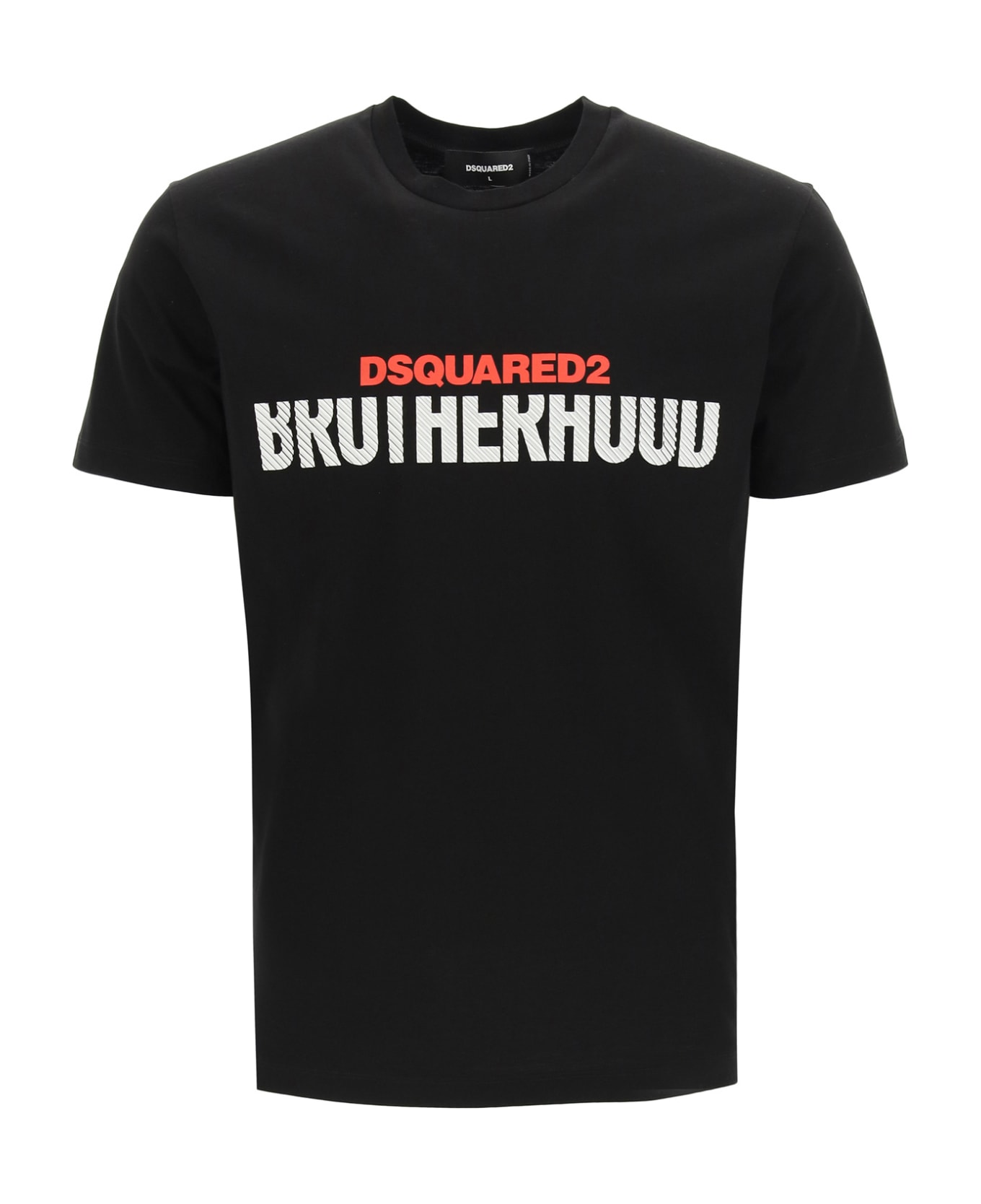 DSQUARED2 T-shirt in classic cut cotton jersey with crew neck and short sleeves. Featuring a printed lettering logo to the front and a printed BROTHERHOOD logo with embossed detailing. The model is 185 cm tall and wears size L.