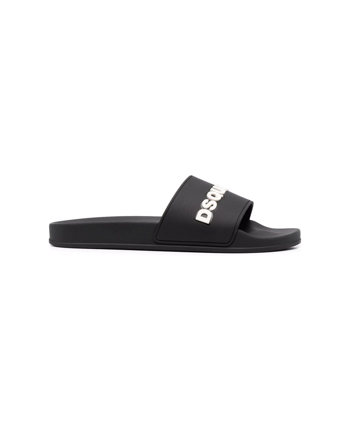 Black slipper for men signed by Dsquared2 made of rubber and characterized by a flat design, round toe and wide upper band with white Dsquared2 print in relief.