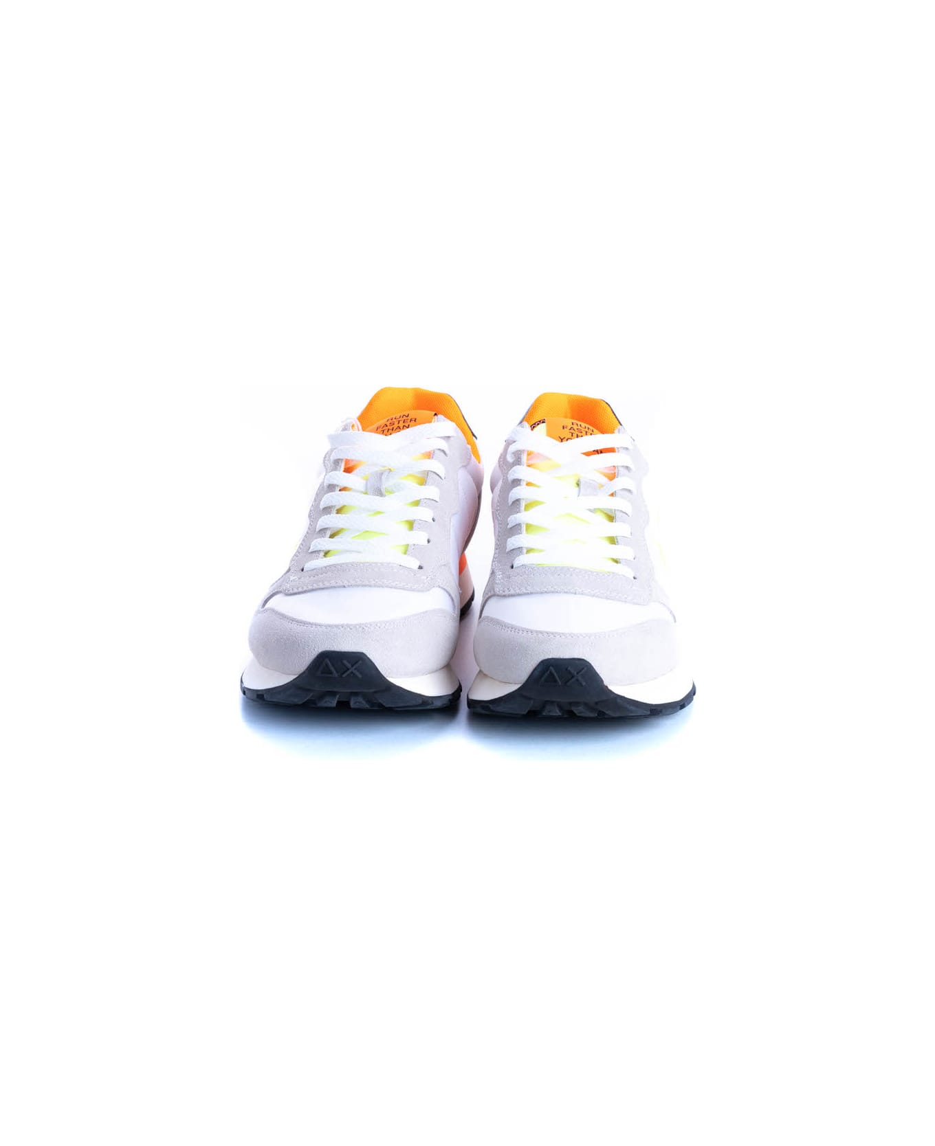 SUN68 men's sneakers "Tom Fluo Nylon White", grey, white, fluorescent orange, upper in Nylon and mesh, with block colors, laces closure, embroidered side logo, year embossed on the back, striped rubber sole colored 2,5cm high.