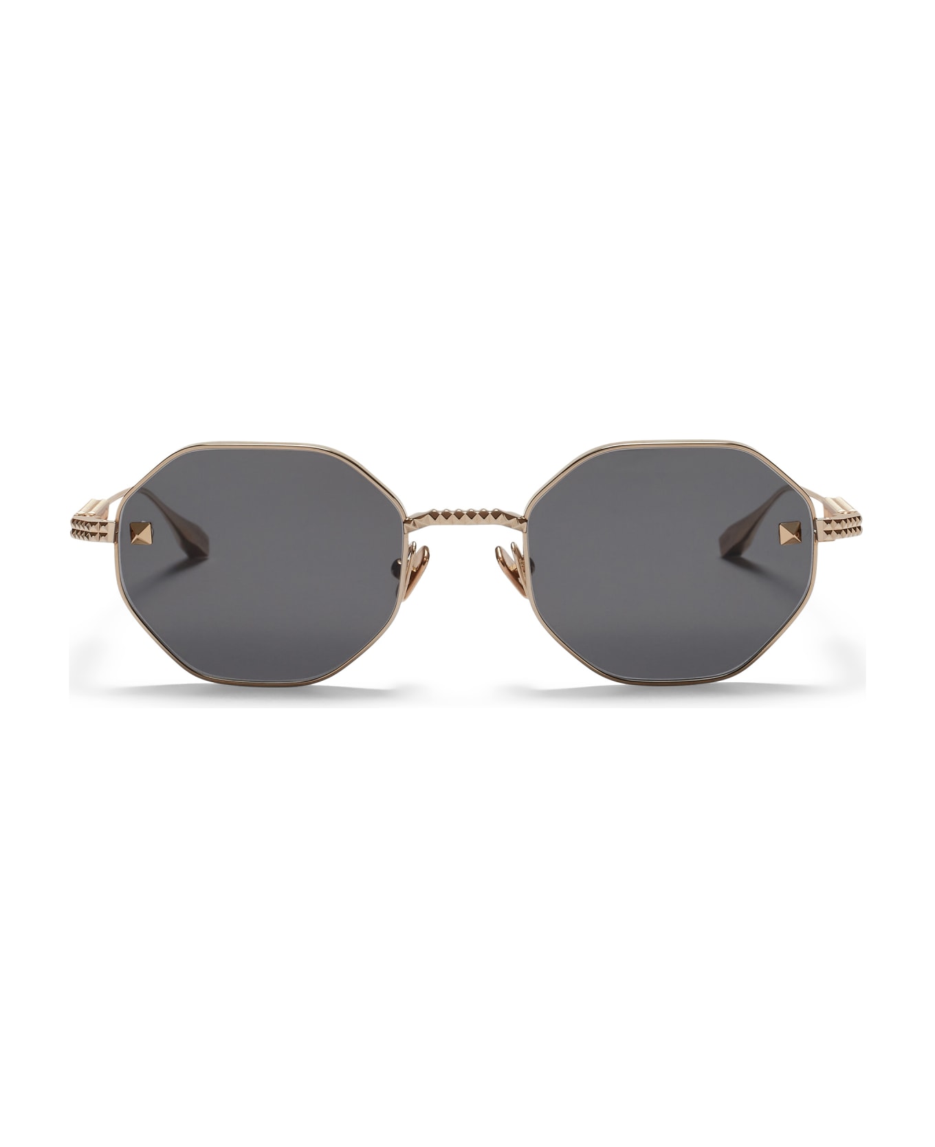 Valentino V-STUD - WHITE GOLD (VLS-122A-52) are hexagonal sunglasses made in Japan. They feature white gold Japanese titanium structure with 3D Valentino studs embellishments, and smoke grey lens with 100% UV protection.