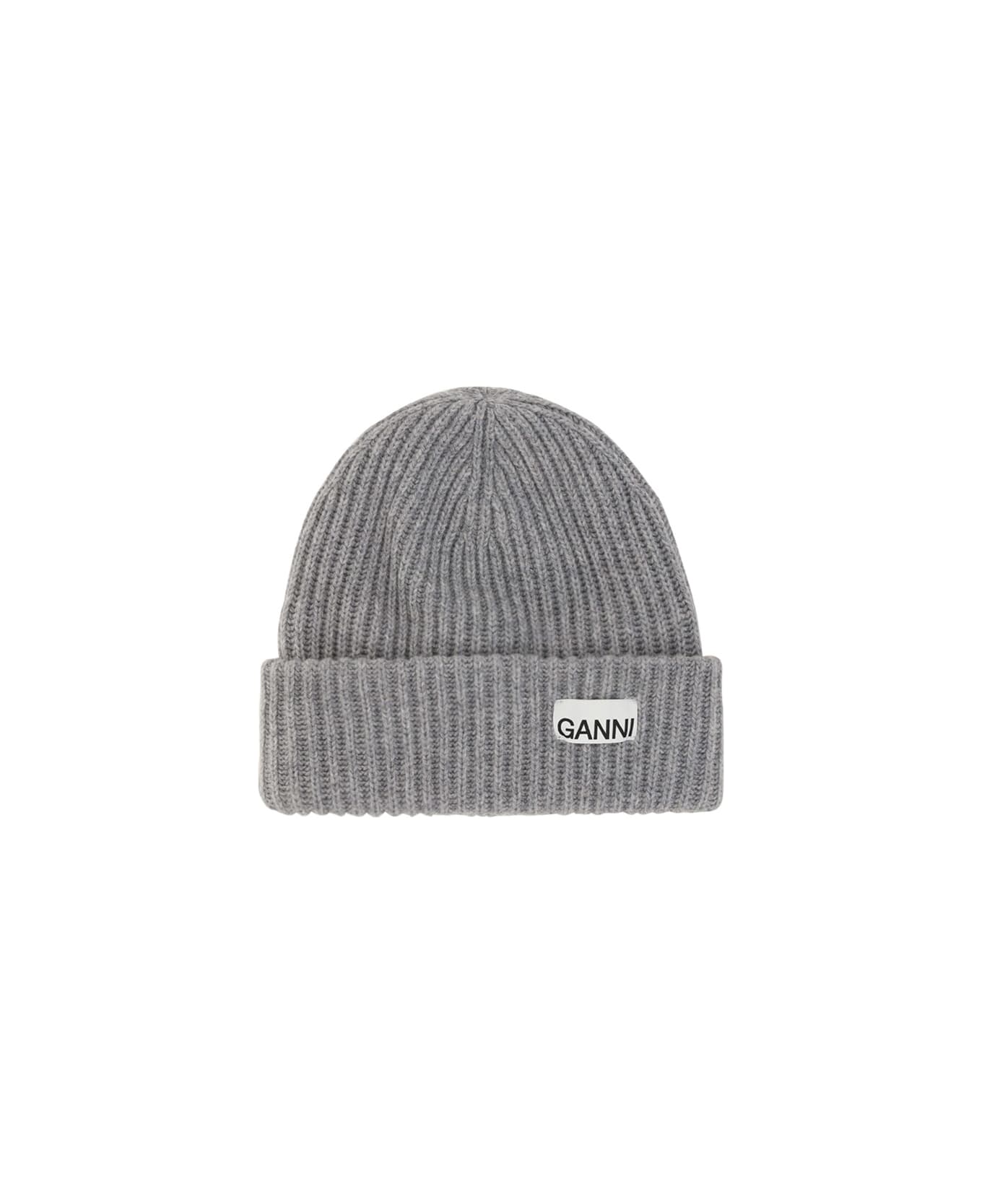 Wool beanie cap by ganni, all-over ribbed design, turn-up hem, patch with iconic brand monogram embroidered on front. Composition: 20% % Nylon, 80% % Wool