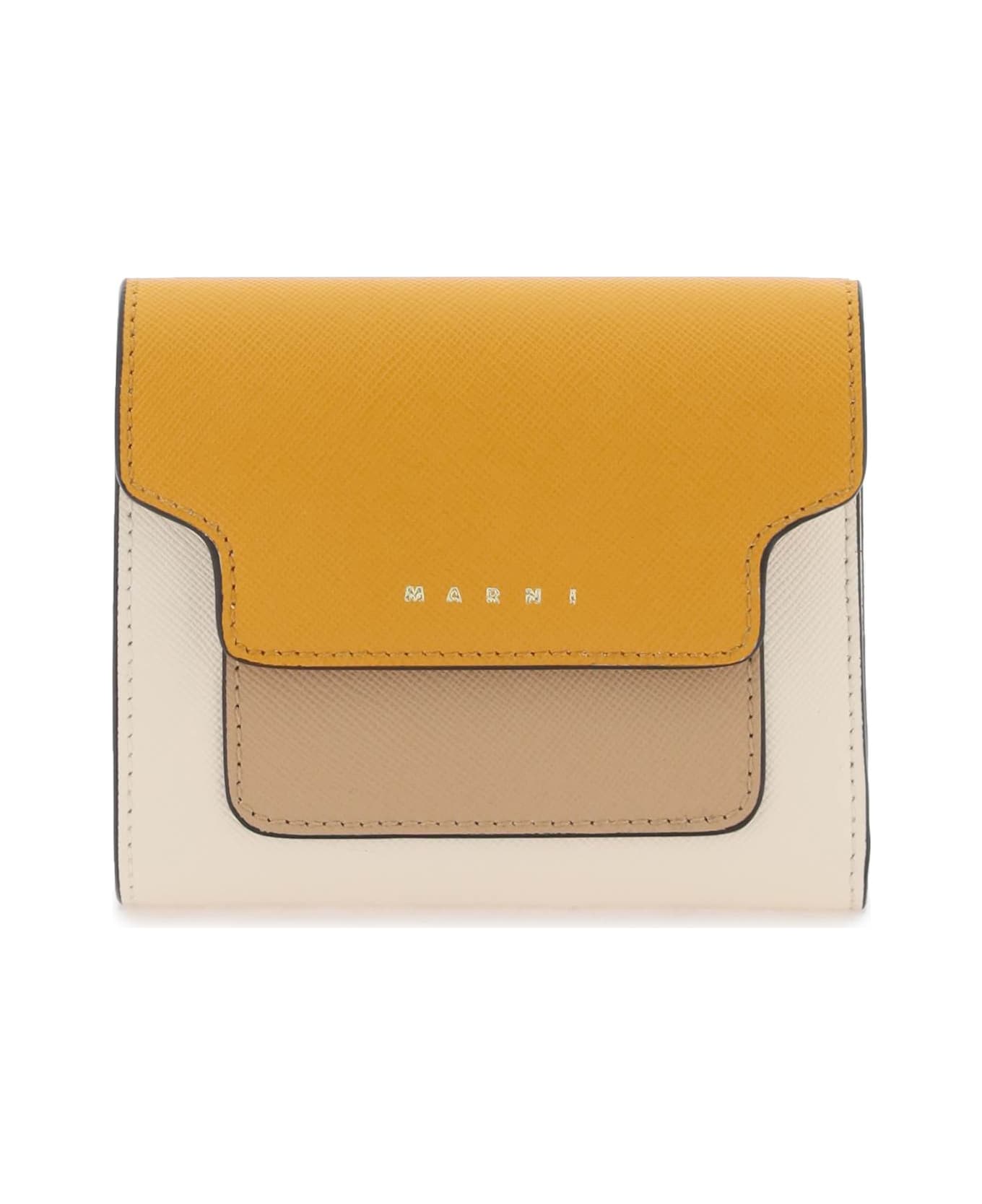 Marni bi-fold wallet crafted in multicoloured saffiano leather, featuring flap with press-stud closure and gold-tone lettering logo print on front. Patch pocket under the flap. Leather interior with a fabric-lined banknote compartment, four ticket pockets, four credit card slots and a zipped coin pocket. Gold-finished metalware. Composition: 100% vitello