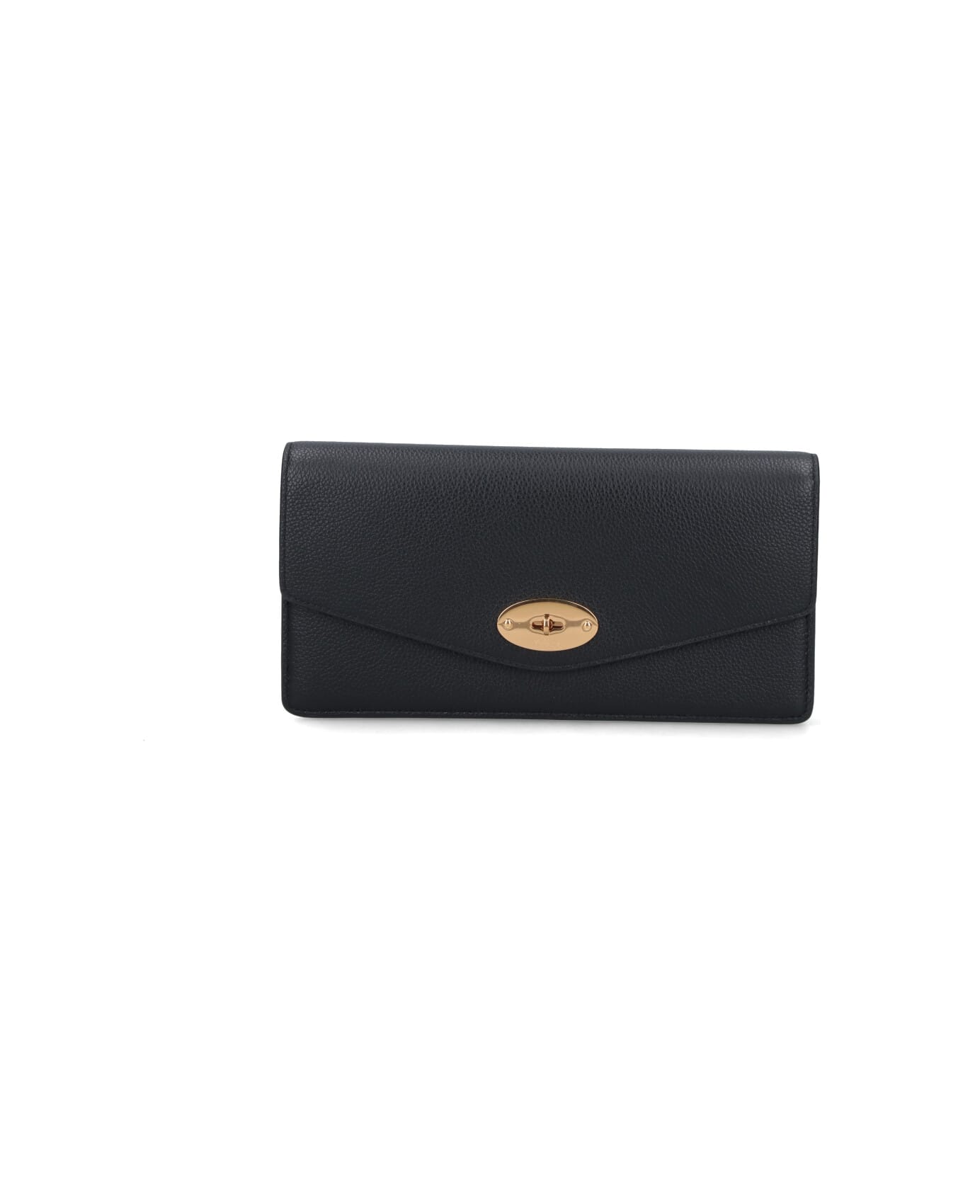 Mulberry 'darley' chain clutch bag in black calf leather, flap closure and gold metal 'postman's lock' detail on the front, gold metal shoulder strap, a zip pocket, card slots and compartments for internal bills.