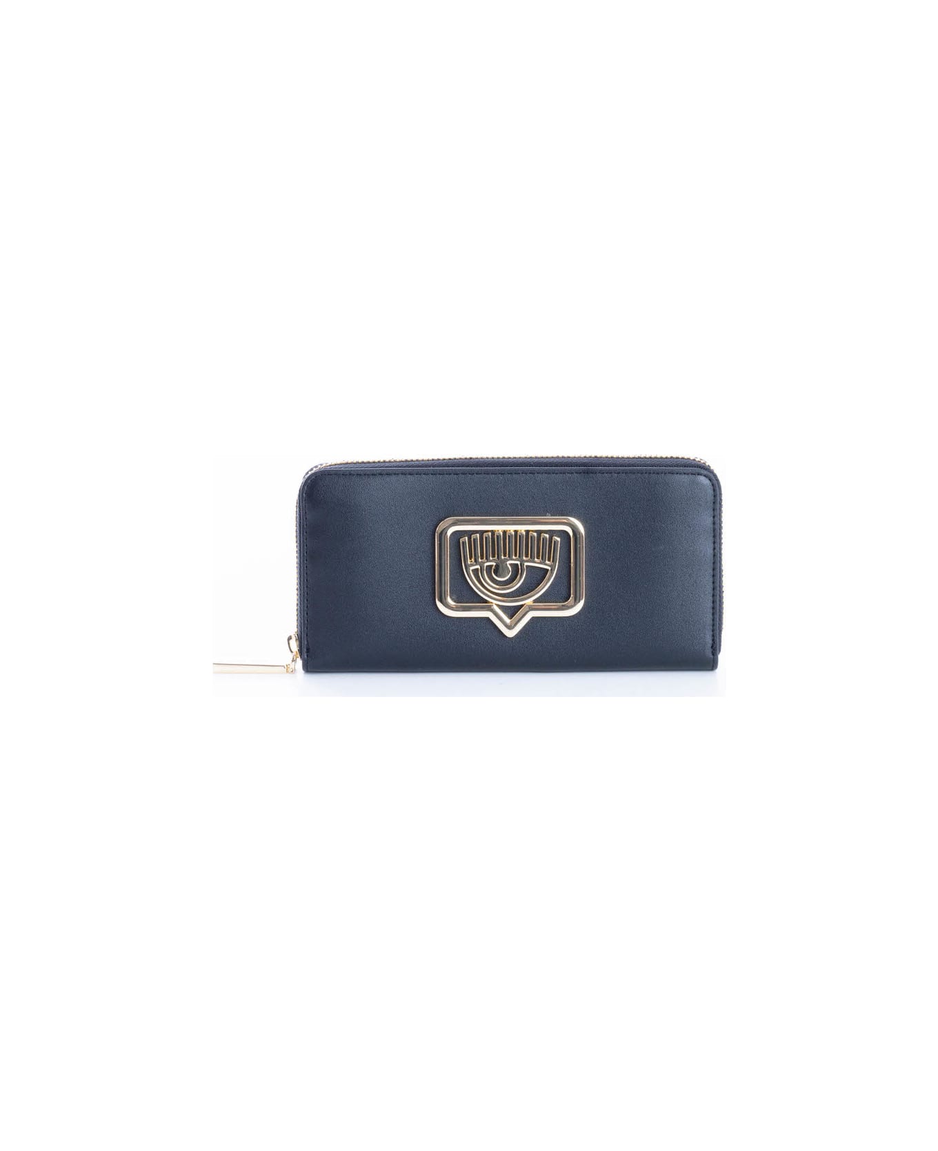 Chiara Ferragni women's wallet "Eyelike Metal Fram", black color, zip fastening, golden metal logo on front, three internal compartments for banknotes, one compartment with zip for coins, ten compartments for credit cards, embossed internal logo, height 9cm , width 19cm, depth 2cm.