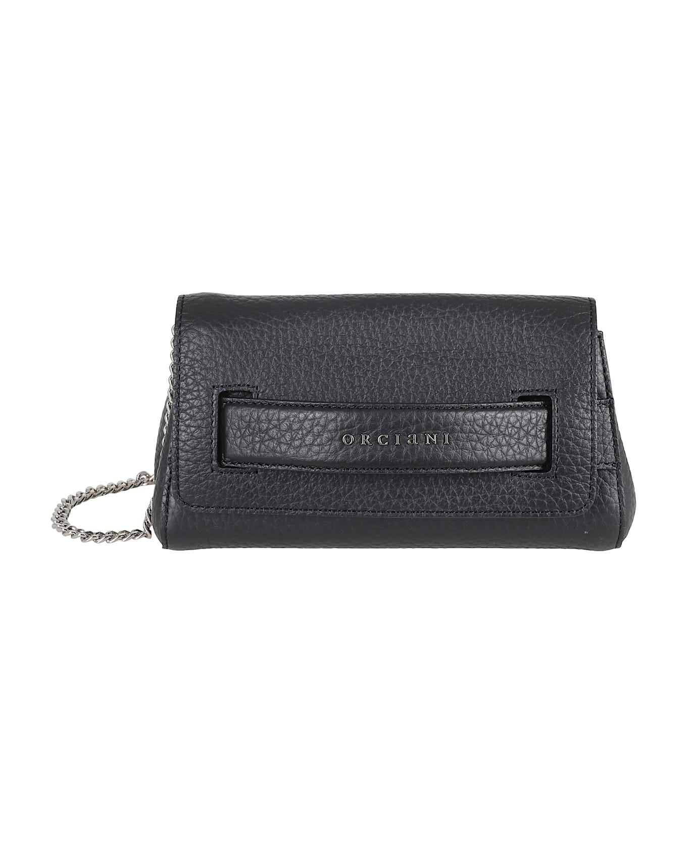 Category: Accessories Item: Gossip Soft Clutch Bag Brand: Orciani Color: Black Pockets: Open interior Details: Removable chain shoulder strap, Palladium finish Closure: With flap SIZE & FIT Width: 20 cm Height: 10 cm Depth: 7 cm