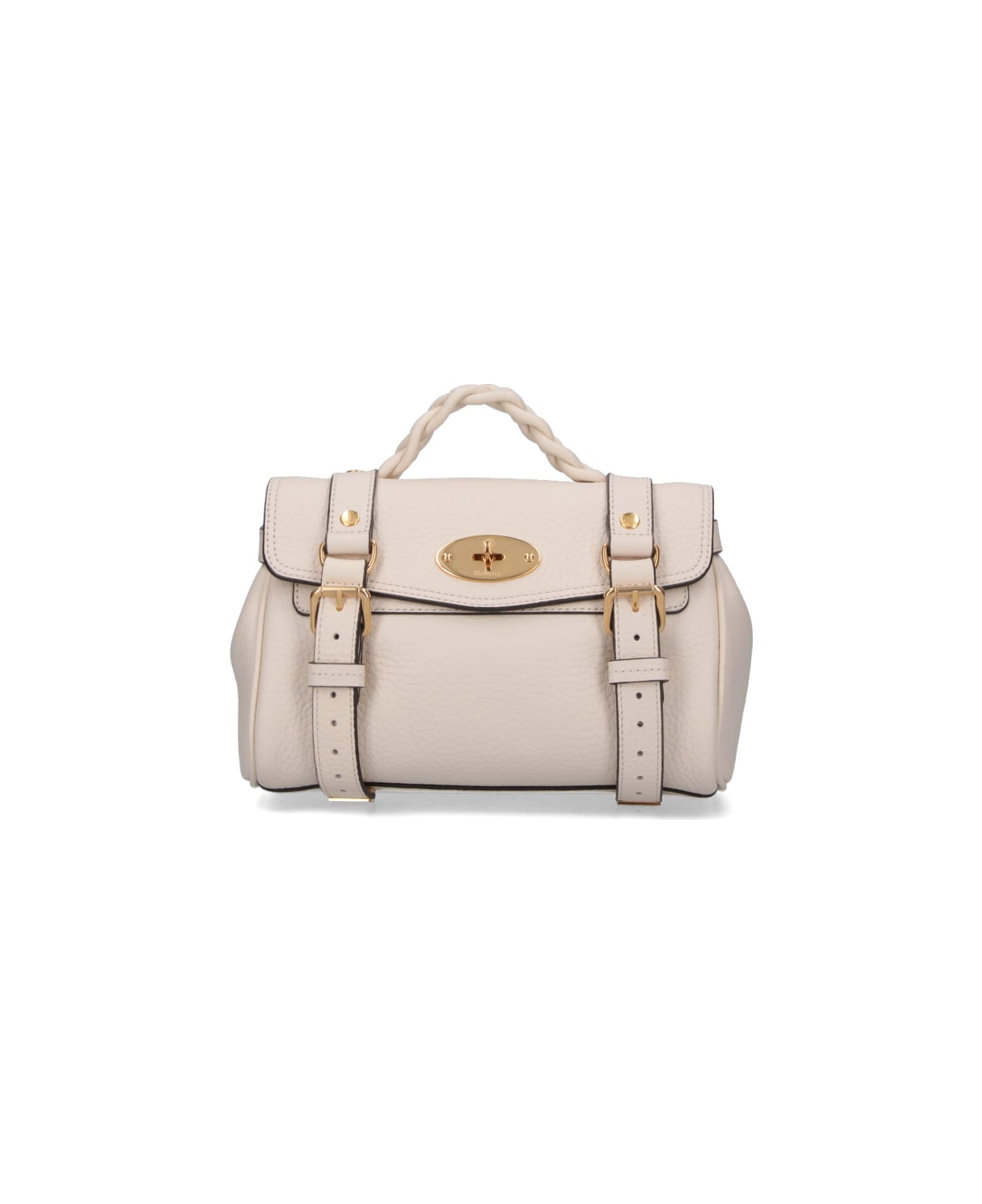 Mulberry 'Alexa' mini bag in cream hammered calf leather with woven top handle, removable and adjustable shoulder strap, buckle closure, walker, and magnetic buttons, front engraved logo detail, inner slip pocket, main inner compartment.