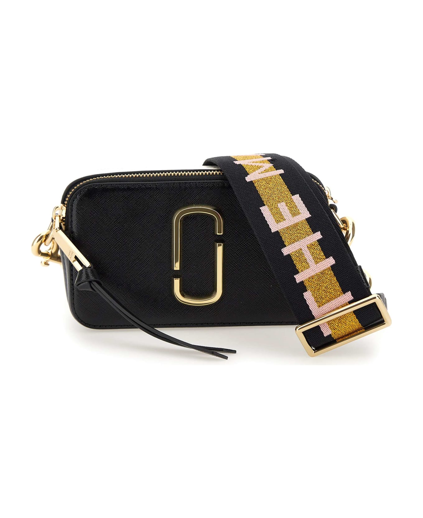 Marc Jacobs "The Snapshot" leather shoulder strap, multicolor shades of smoky grey, black and white, removable logoed shoulder strap with gold glitter maxi line and baby pink writing, double upper compartment with zip and leather zip puller, front metal logo, one slit pocket on back, shiny gold hardware, one internal slit pocket. Dimensions: width 18cm, height 10. 5cm, depth 6cm. Shoulder strap length 126cm.